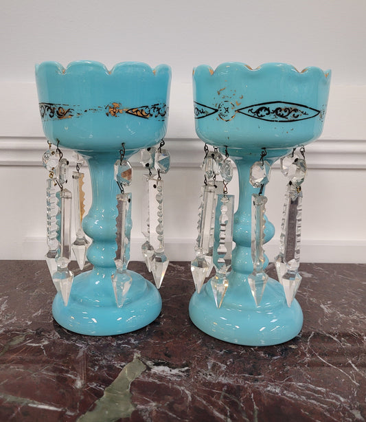 Pair of Blue Opaline Glass Victorian Lus...