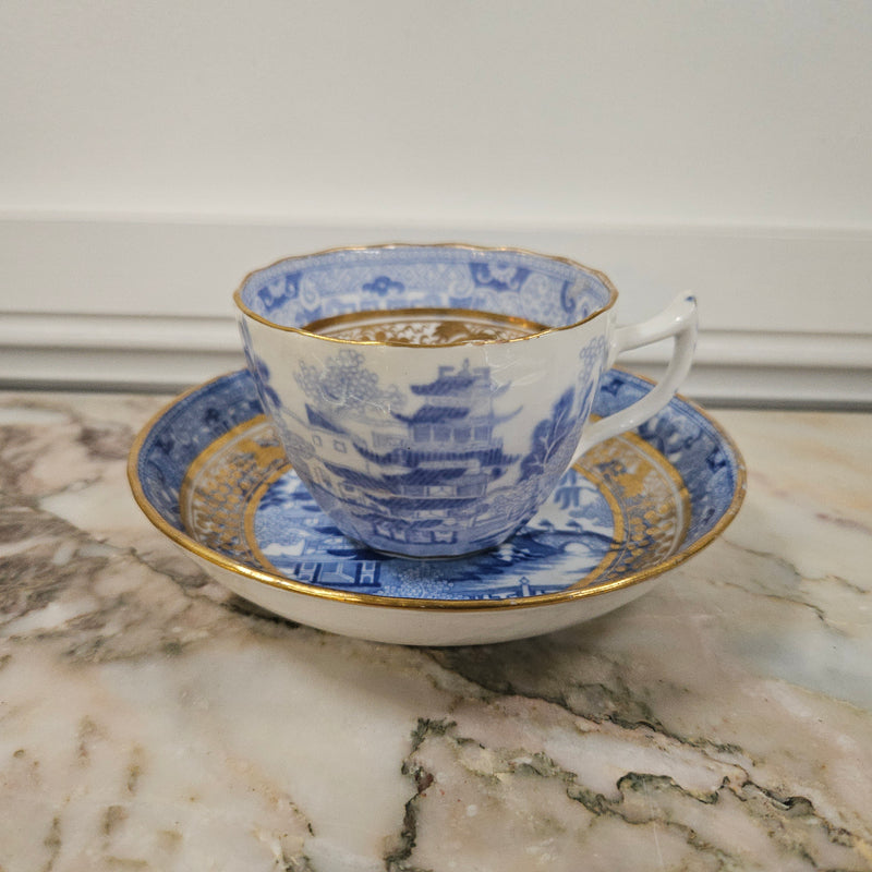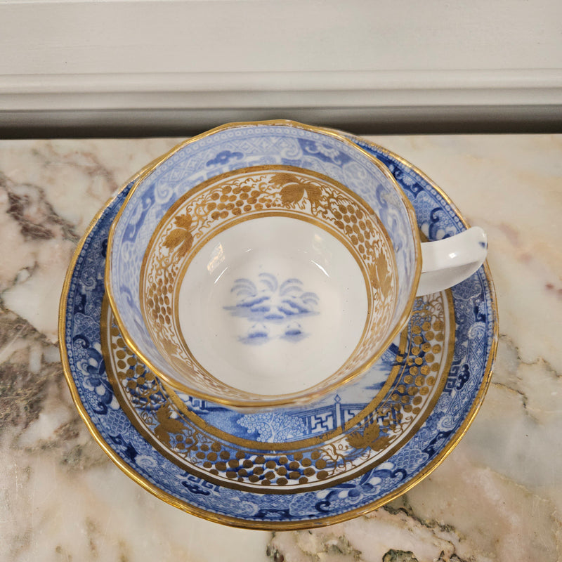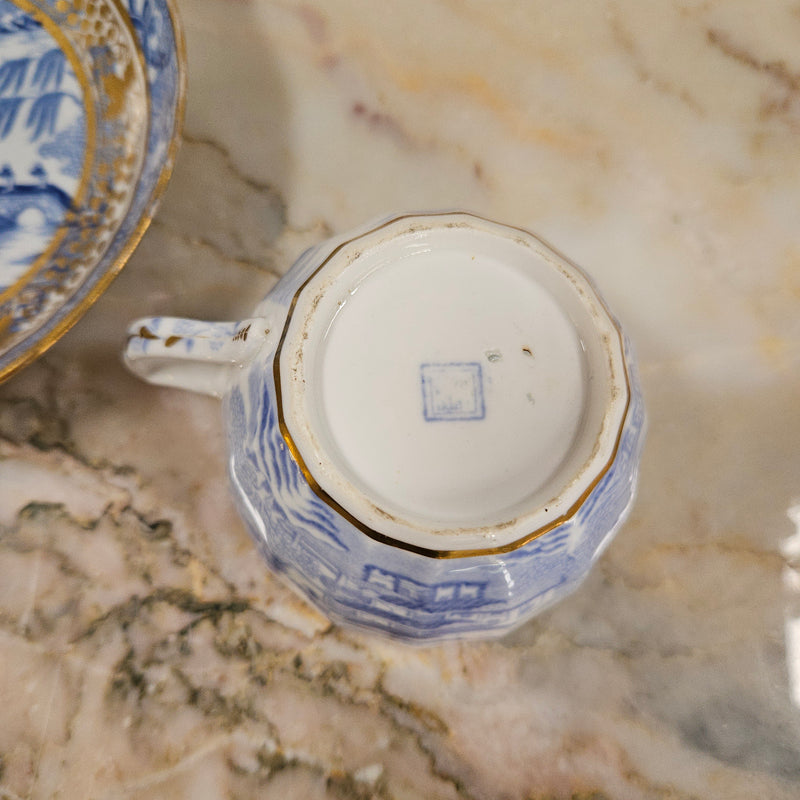 Lovely 18th Century Worcester cup and saucer in blue, white and gold gilt. Pseudo oriental marks to base. It is in good original condition with some fading to the rim and gilding. Please see photos as they form part of the description.