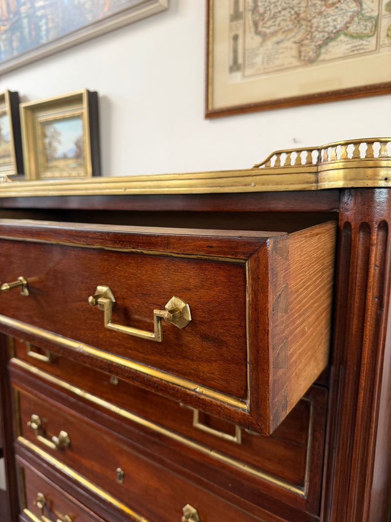 19th Century French Rosewood Louis XVI style semanier. It has seven drawers superb ormolu mounts with a marble top and a period gallery. In good original condition. Please view potos as they help to form part of the description and condition.