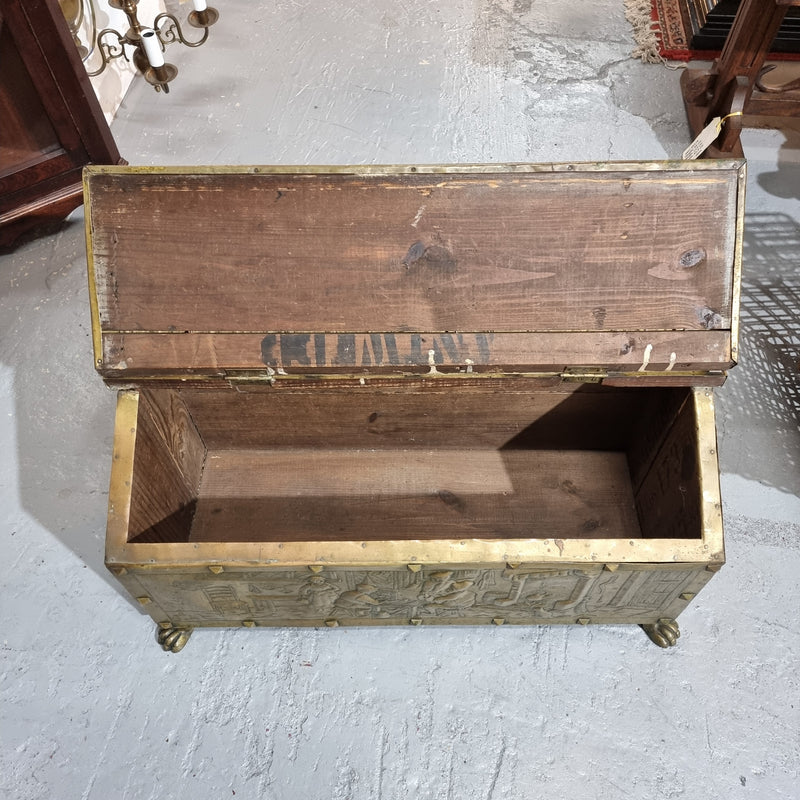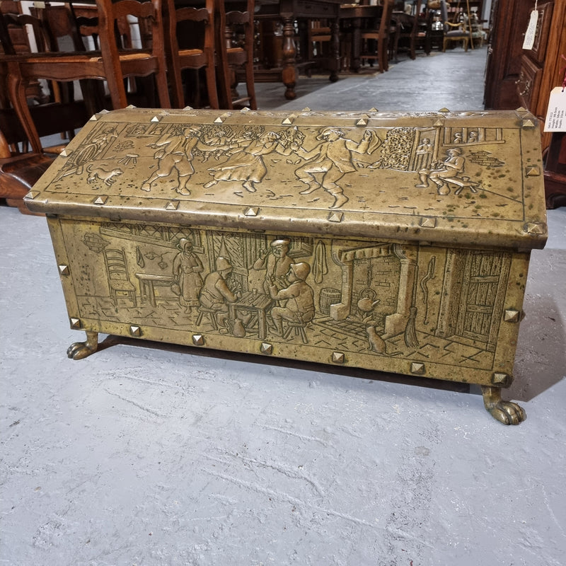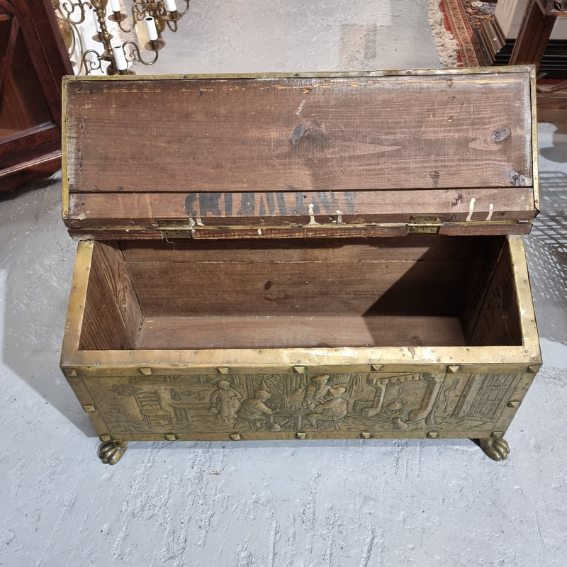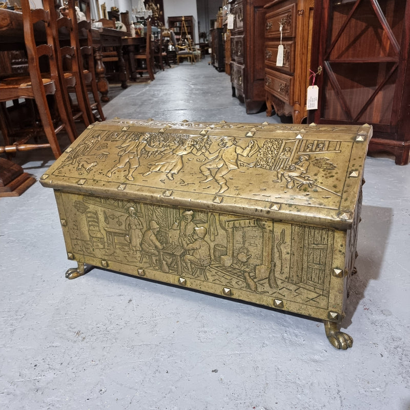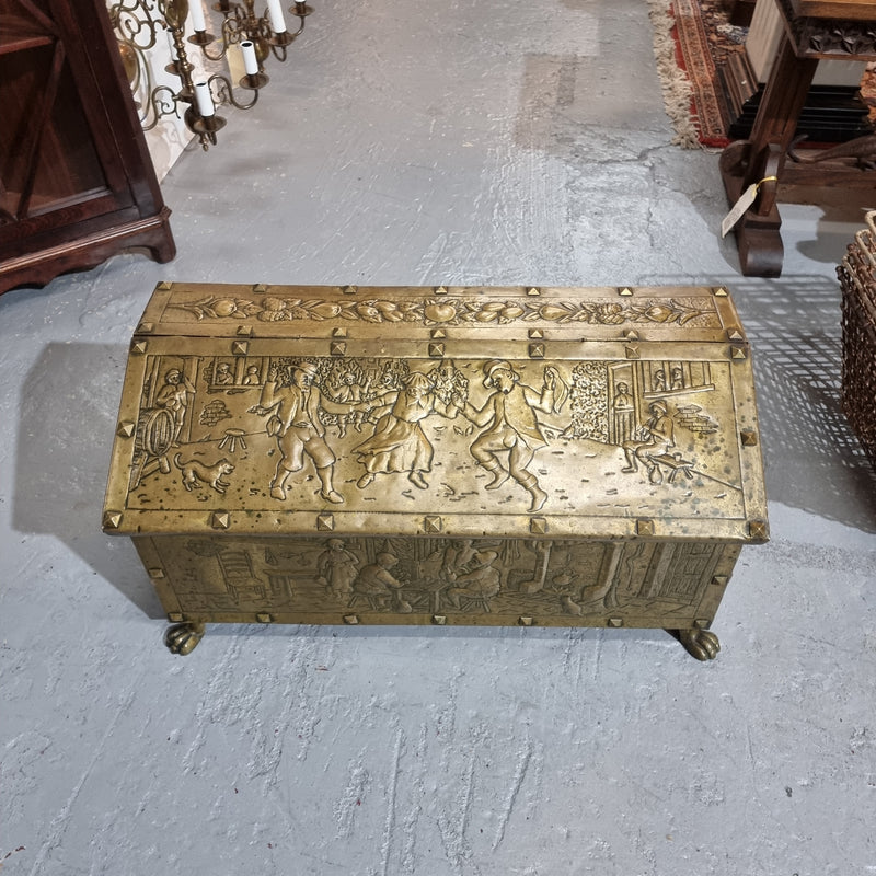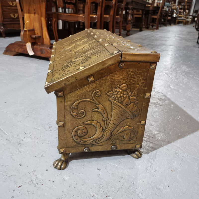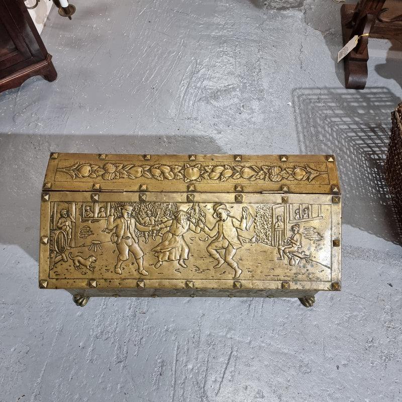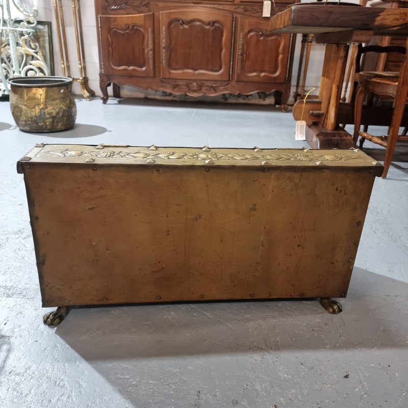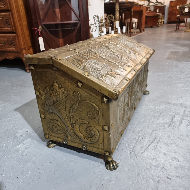 A highly decorative 19th Century French Embossed gilt brass fire coal box with a wooden lining. It can be used for multiple storage uses and has been sourced directly from France. In good original detailed condition. Please view photos as they help to form part of the description and condition.