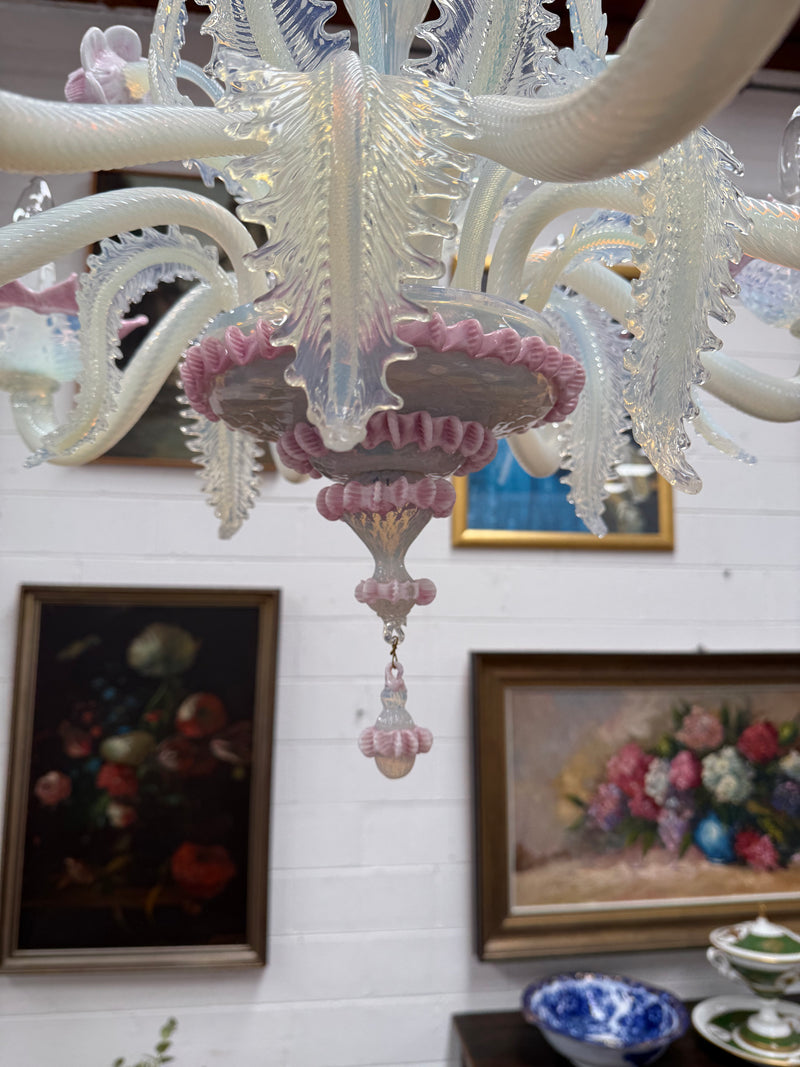 A rare Mid-Century Italian soft pink and milky pearl Murano glass eight branch Chandelier. In good condition. It has been rewired to Australian standards. Please see photos as they help to form part of the description and condition.