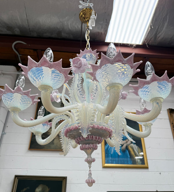 A rare mid century italian Soft pink and milky pearl Murano glass eight branch Chandelier. In good condition and had been rewired. Please see all photos.