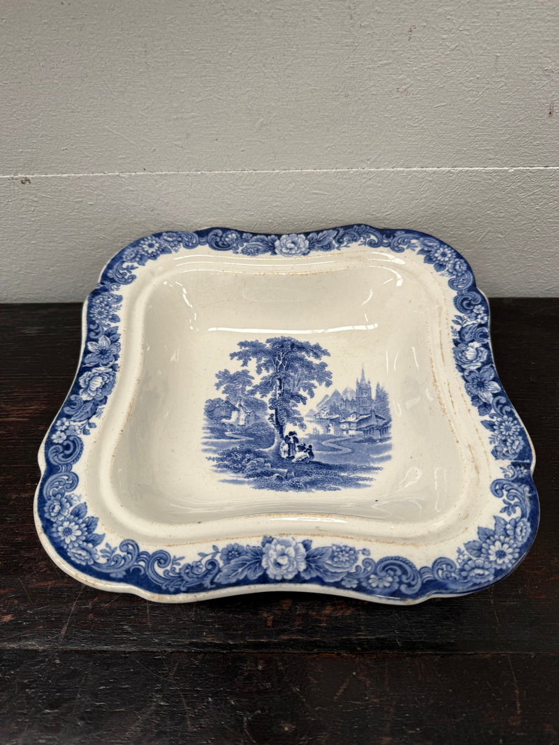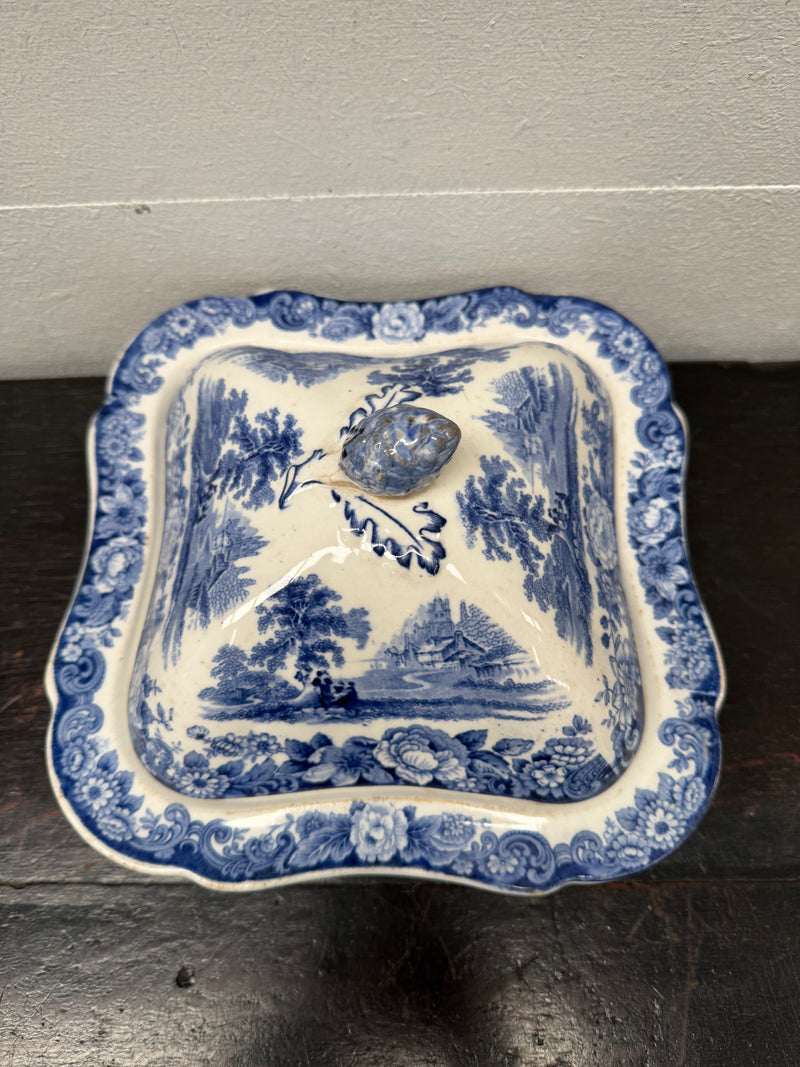 Antique English blue and white lidded tureen dish with country scenes with makers mark to the bottom. It is in good original condition with some signs of age. Please see photos as they form part of the description.