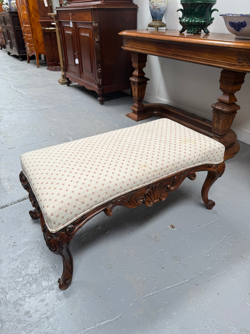 Beautifully carved Walnut and upholstered double stool. Circa 19th century. In good original condition. Please see photos as they form part of the description and condition.