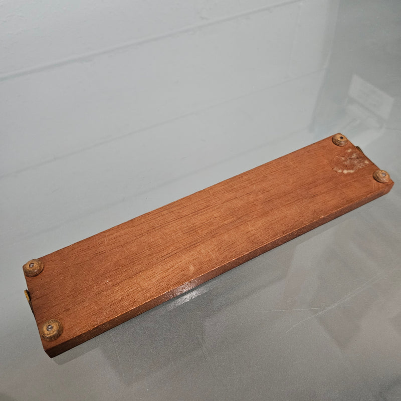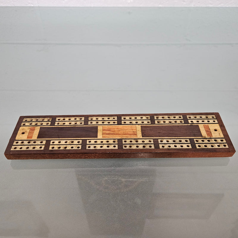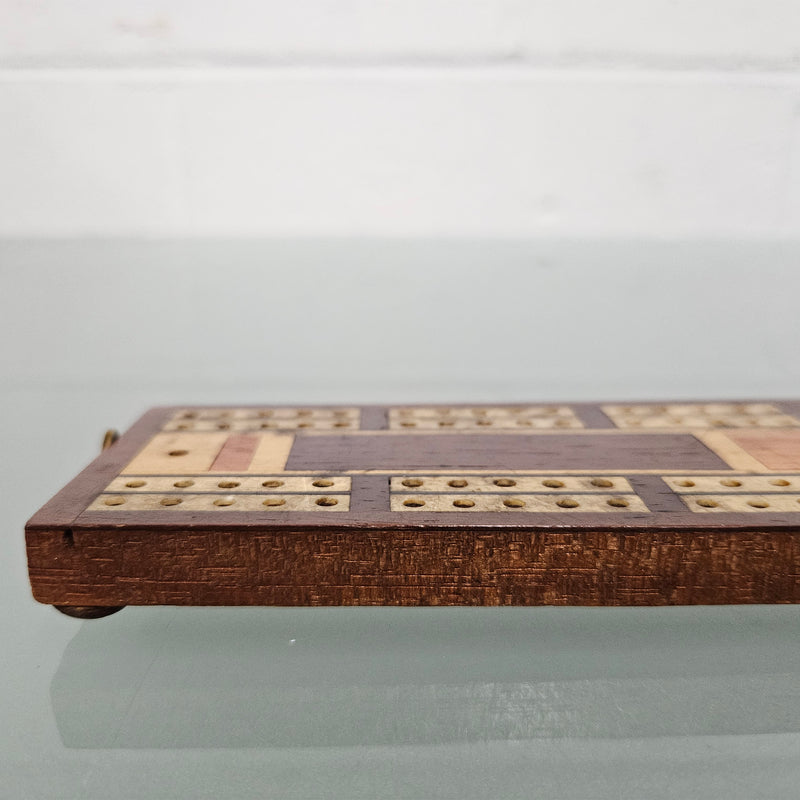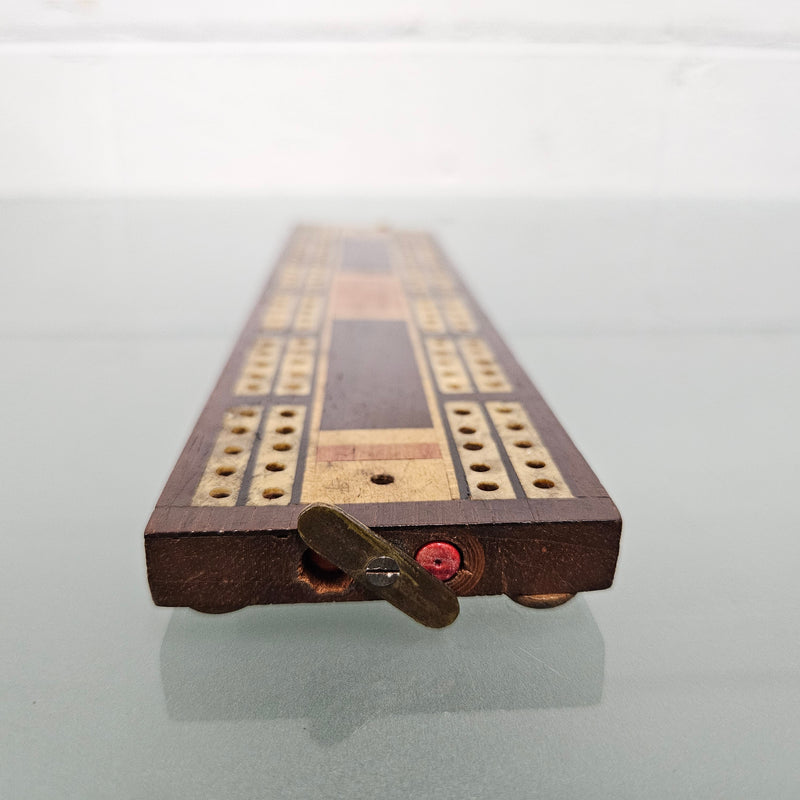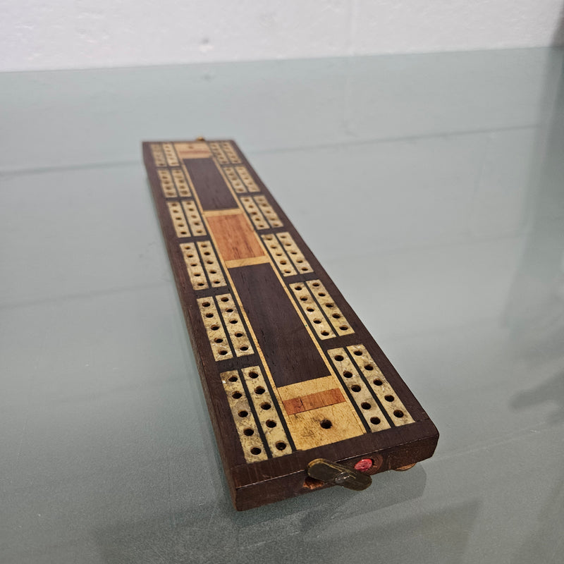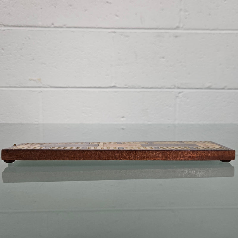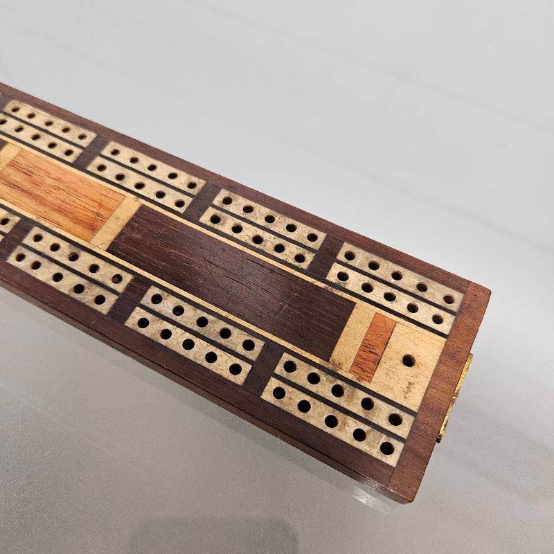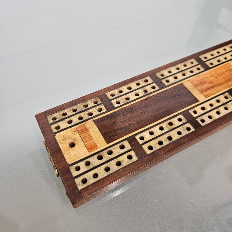 Antique cribbage board inlaid with various timbers and bone with storage for pegs on either end. It is in good original condition. Please see photos as they form part of the description.