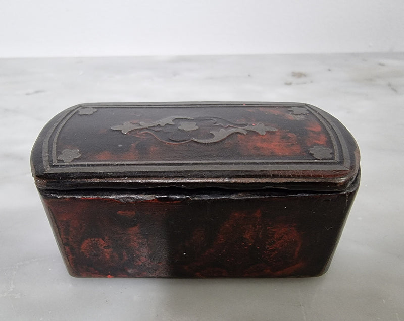 Beautiful Antique early 19th Century paper mache and faux Tortoiseshell snuff box with silver inlaid. It is in good original condition.