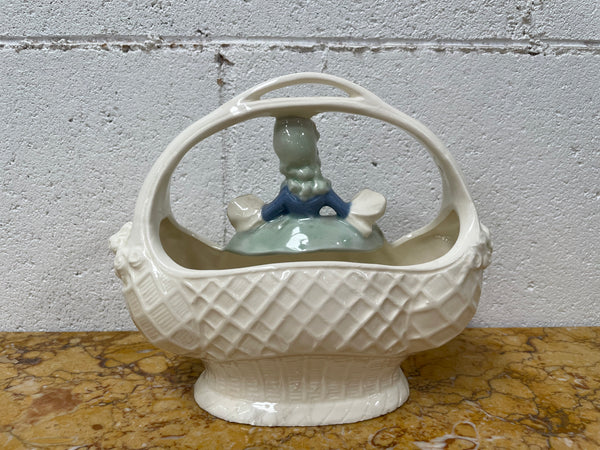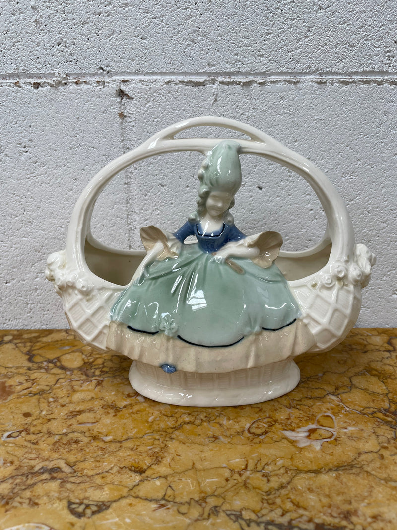 Antique basket vase of lady figurine, it has some floral details and is in good original condition. Please see photos as they form part of the description.