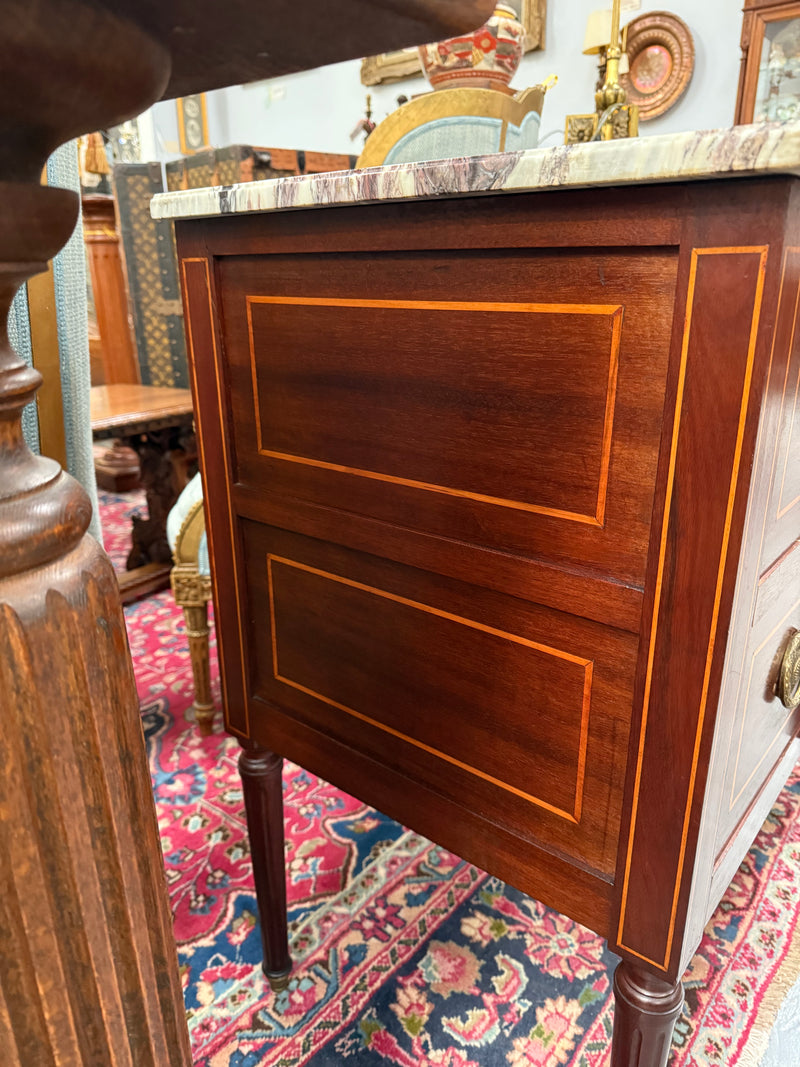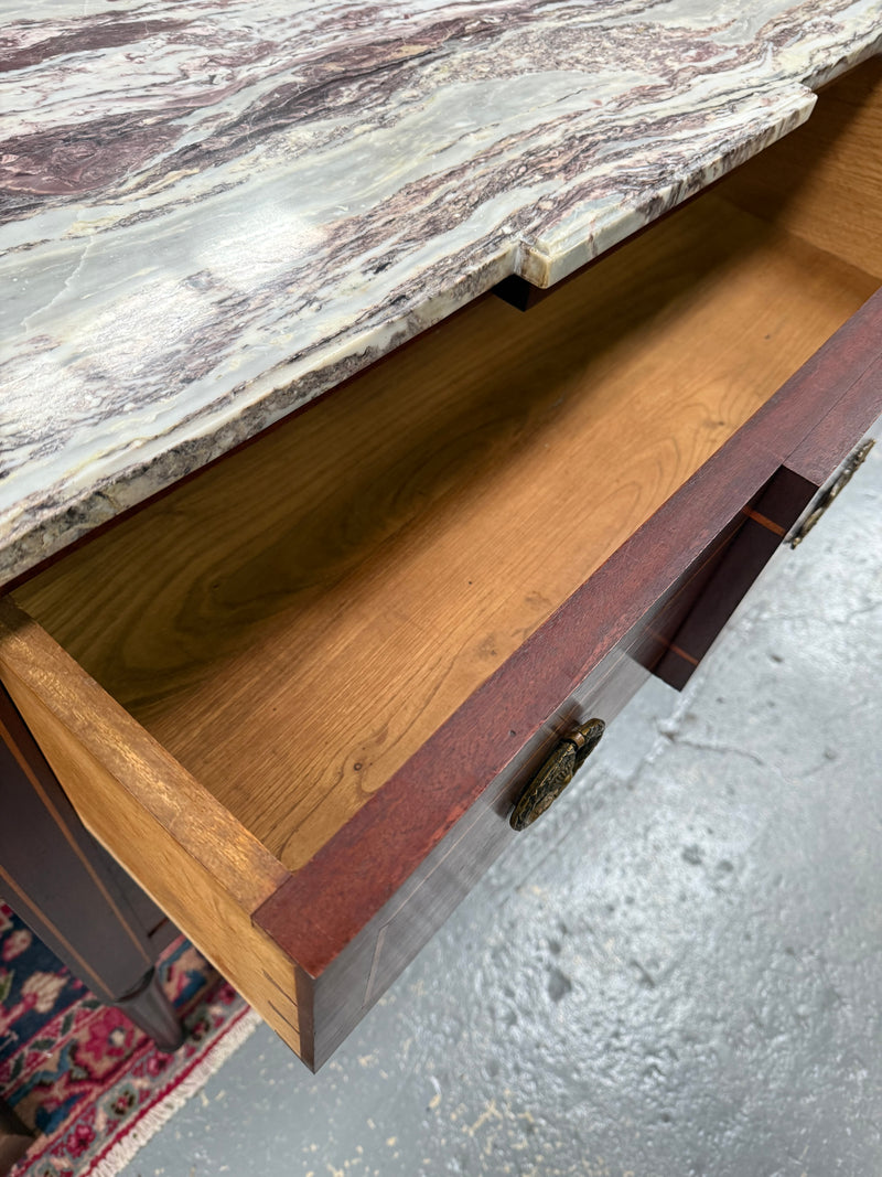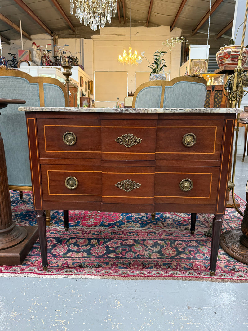 Antique French transitional style marble top commode. With a stunning marble top, two good sized drawers and beautiful fluted legs. It is in good detailed and restored condition. Please see all photos as they form part of the description and condition.