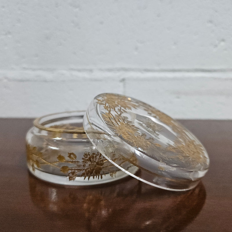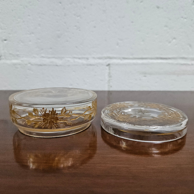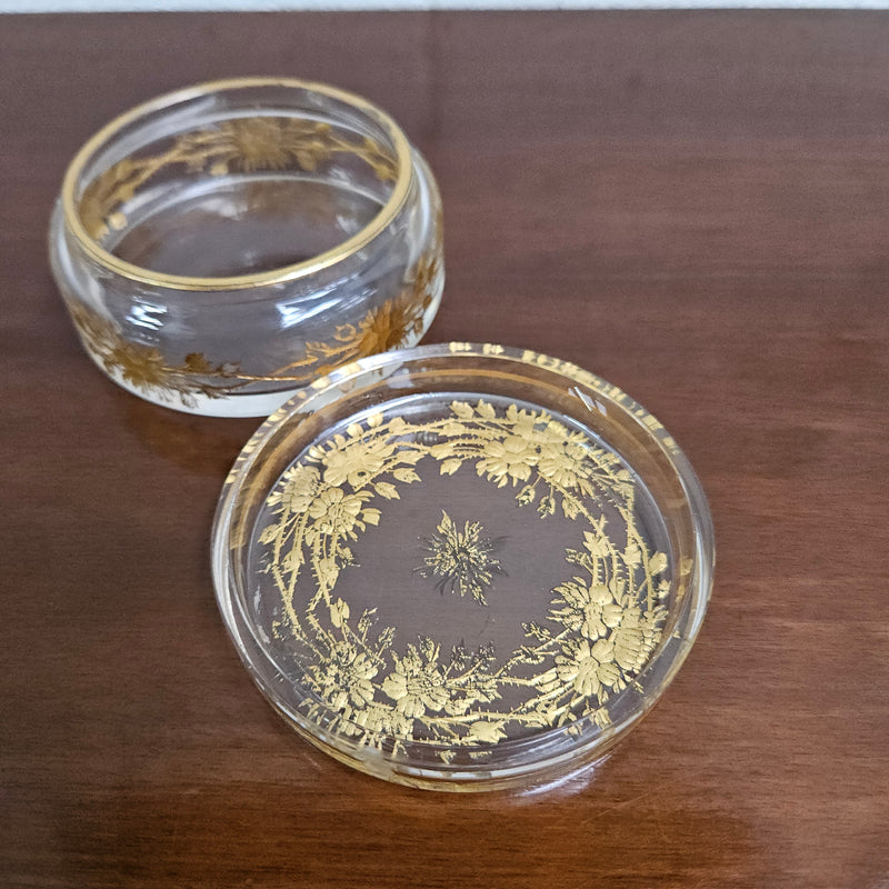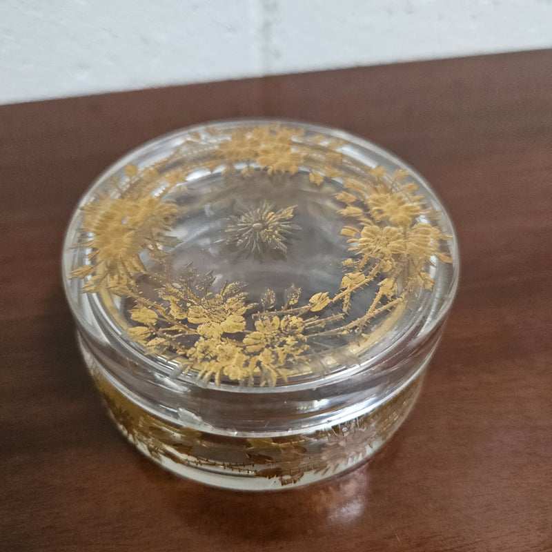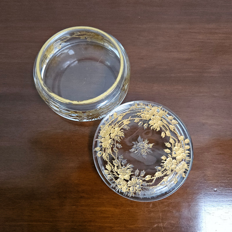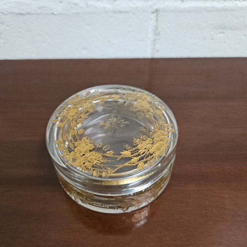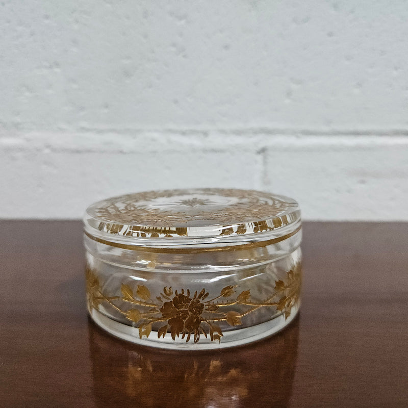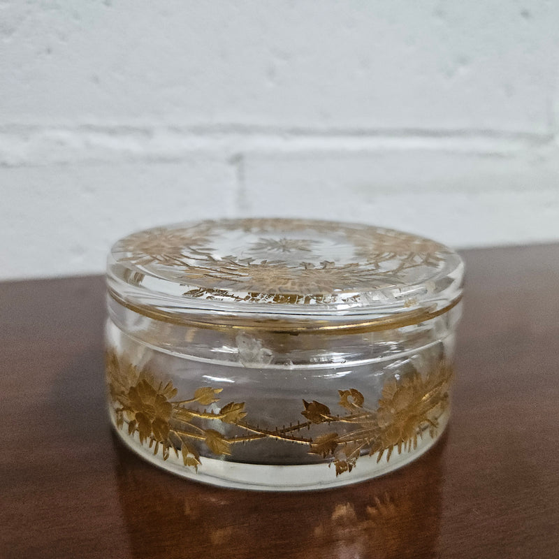 Beautiful French Antique gilt & crystal glass round box, there is some wear to the rim of the box. Otherwise it is in good original condition. Please see photos as they form part of the description.
