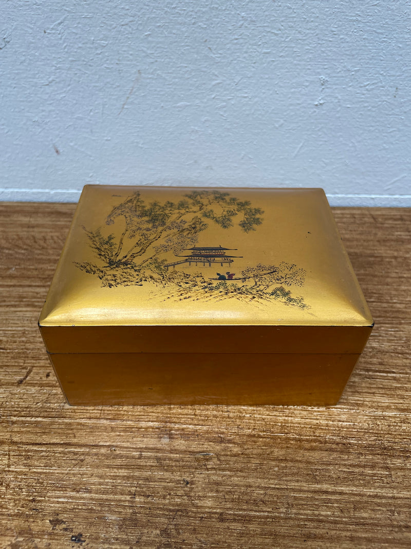 Antique gilt lacquer trinket box featuring an oriental scene. In good original condition. Please see photos as they form part of the description.