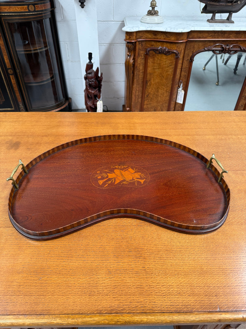 Antique kidney shaped double brass handled tray with wooden gallery and beautiful inlay. In good original condition. Please see photos as they form part of the description.