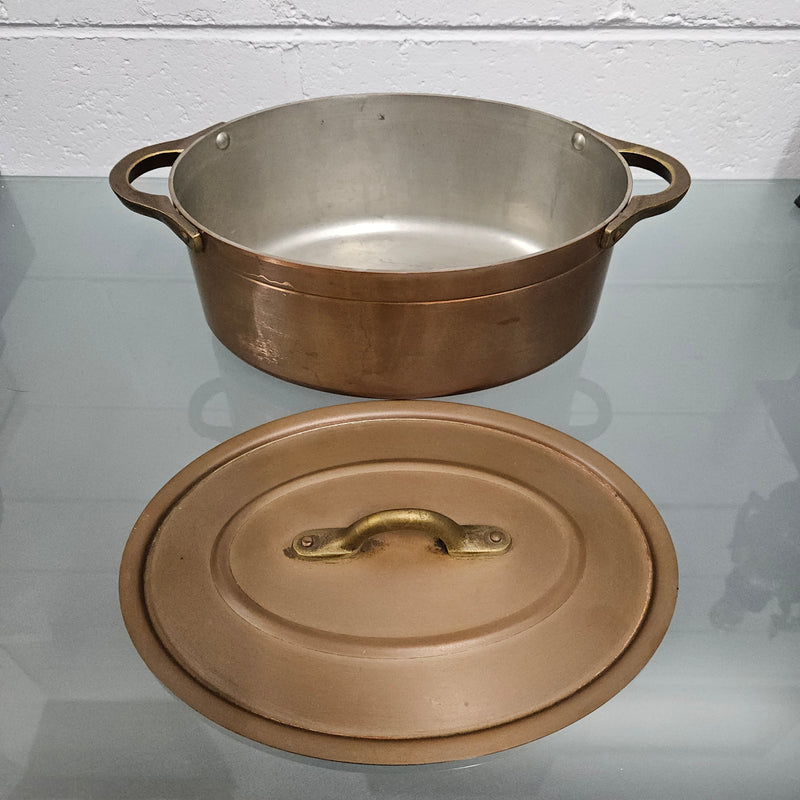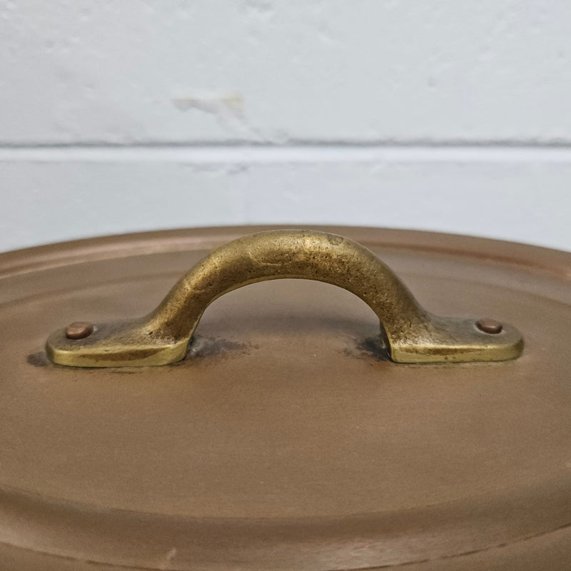 Lovely antique large brass handled, copper and internal tin lined pot. It has two handles and a lid. Comes in two other sizes, sold separately. It is in good original condition. Please see photos as they form part of the description.