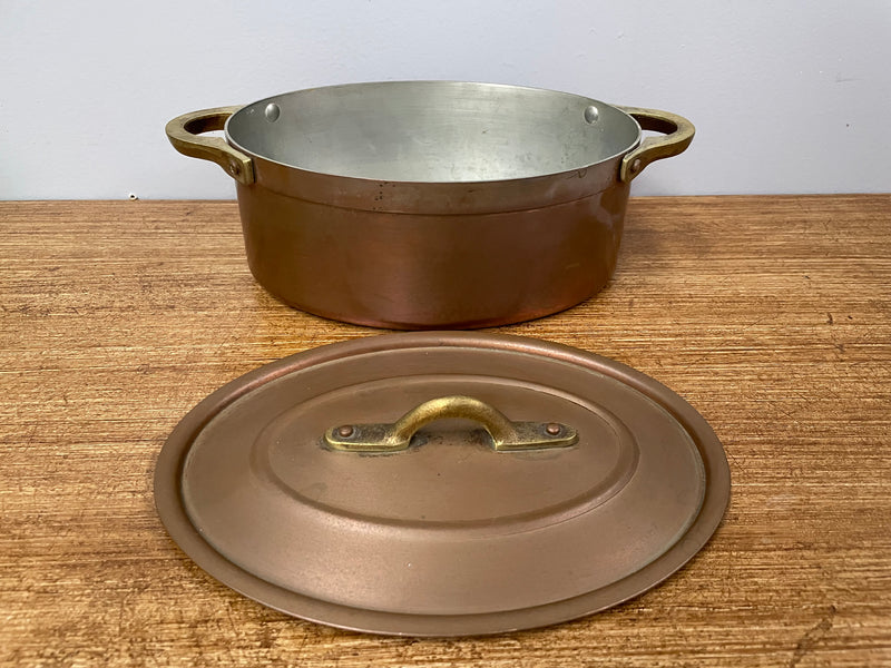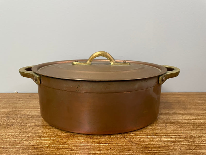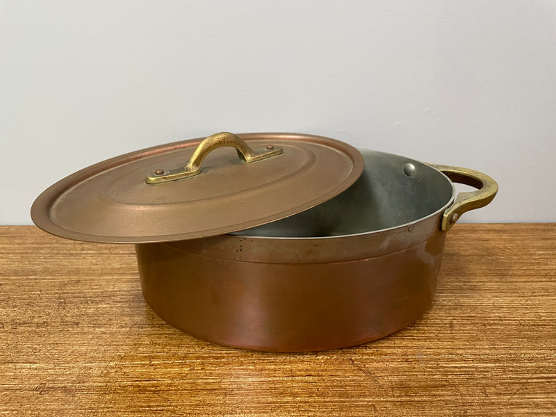 Lovely medium brass handled, copper and internal tin lined pot. It has two handles and a lid. Comes in two other sizes, sold separately. It is in good original condition. Please see photos as they form part of the description and condition.