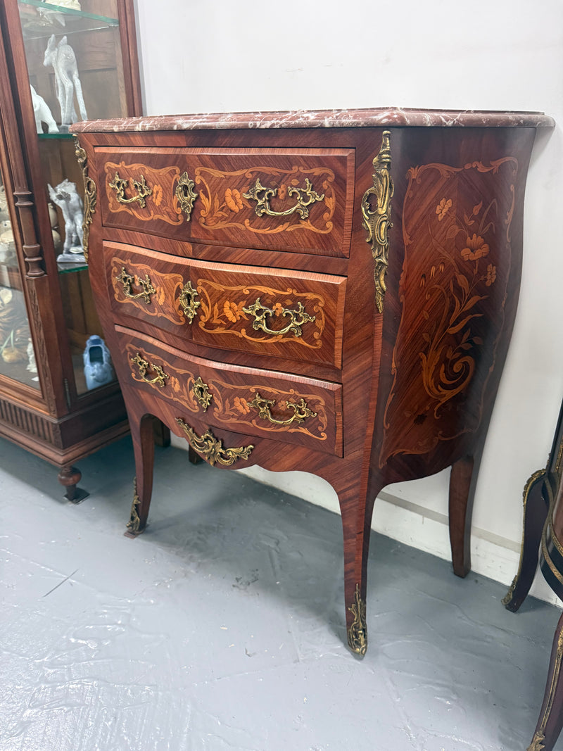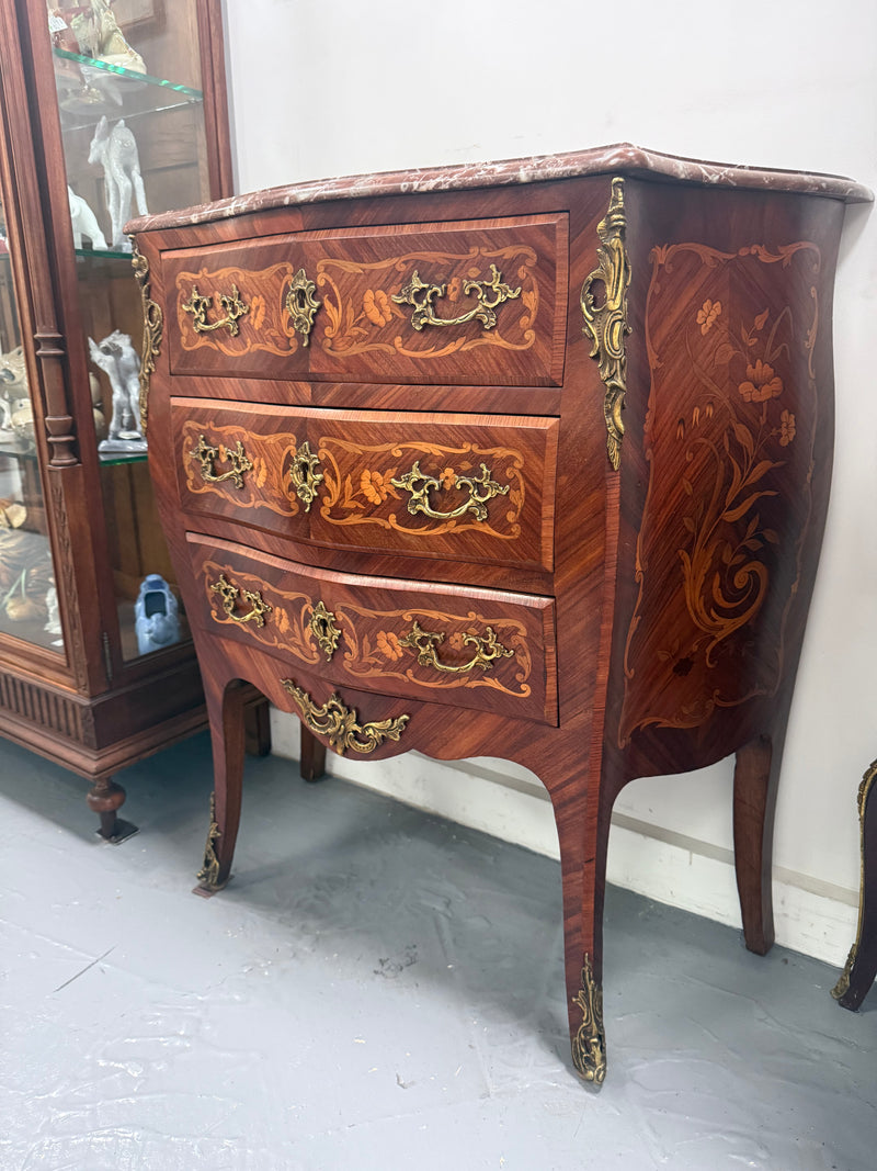 Extraordinary Antique Louis XV style marquetry marble top commode with three drawers and amazing details, it is Circa 1900. It is in good original condition. Please see photos as they form part of the description and condition.