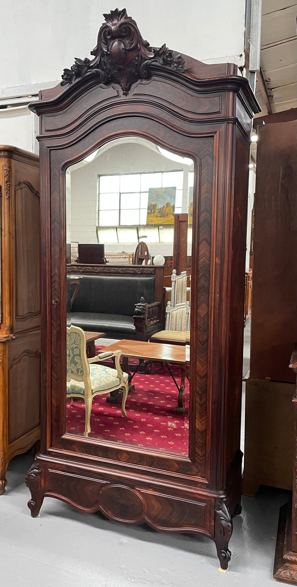 Antique Louis XV Style Rosewood Single Door Armoire Antique 19th century Louis XV style single mirrored door armoire. A high quality French wardrobe with five shelves, four being fully adjustable, one lockable drawer and one hidden drawer at the bottom. Sourced from France and in good original detailed condition. Australia Wide Delivery We can arrange delivery to: Melbourne, Hobart, Launceston, Sydney, Adelaide, Perth, Canberra, Brisbane, and regional centres. Add this item to your cart and we will get back to you with a shipping quotation. Requesting a quote will place a 24 hour hold on the item to ensure you don't miss out while awaiting a delivery quote.