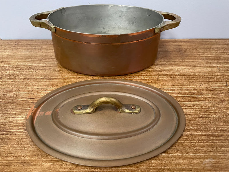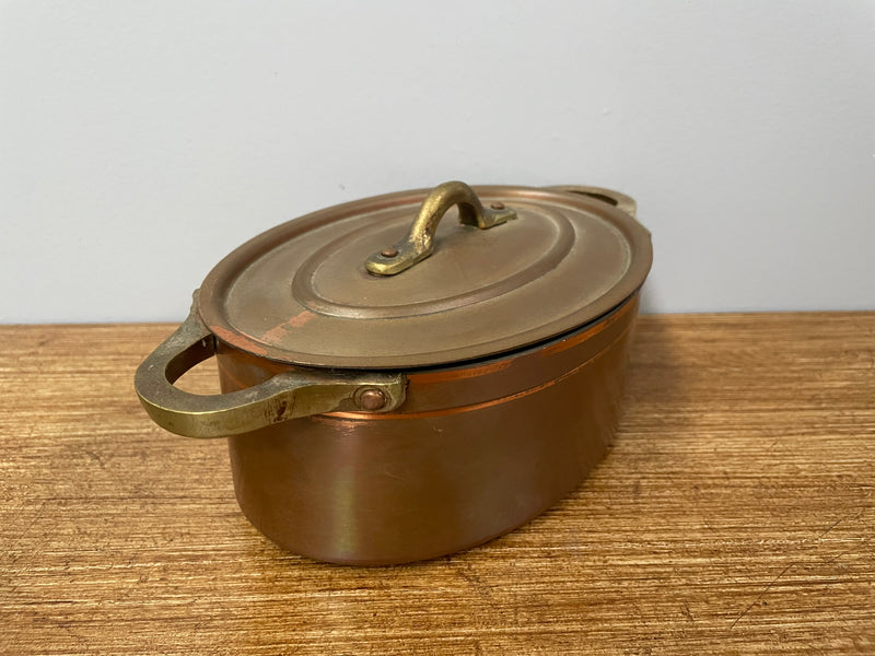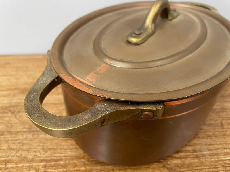 Lovely antique small brass handled, copper and internal tin lined pot. It has two handles and a lid. Comes in two other sizes, sold separately. It is in good original condition. Please see photos as they form part of the description.