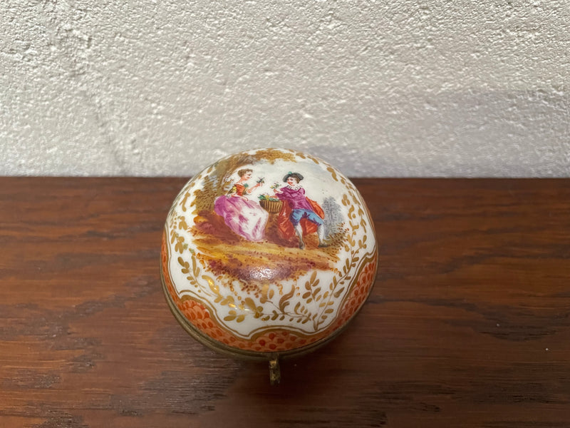 Beautifully decorated antique Meissen round hinged lid trinket box. Circa: 1900. In good condition, Please see photos as they form part of the description.