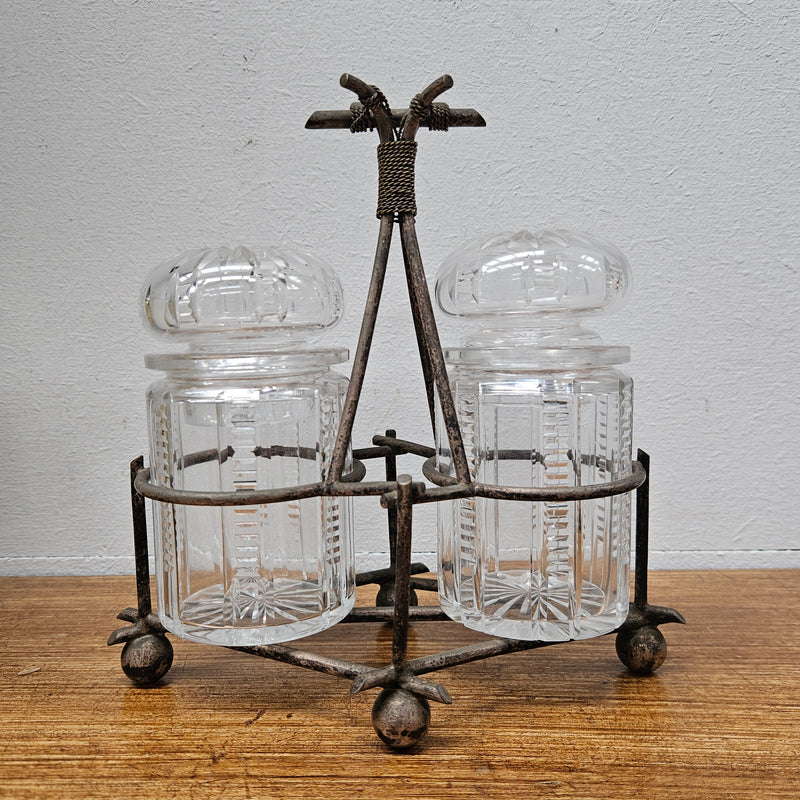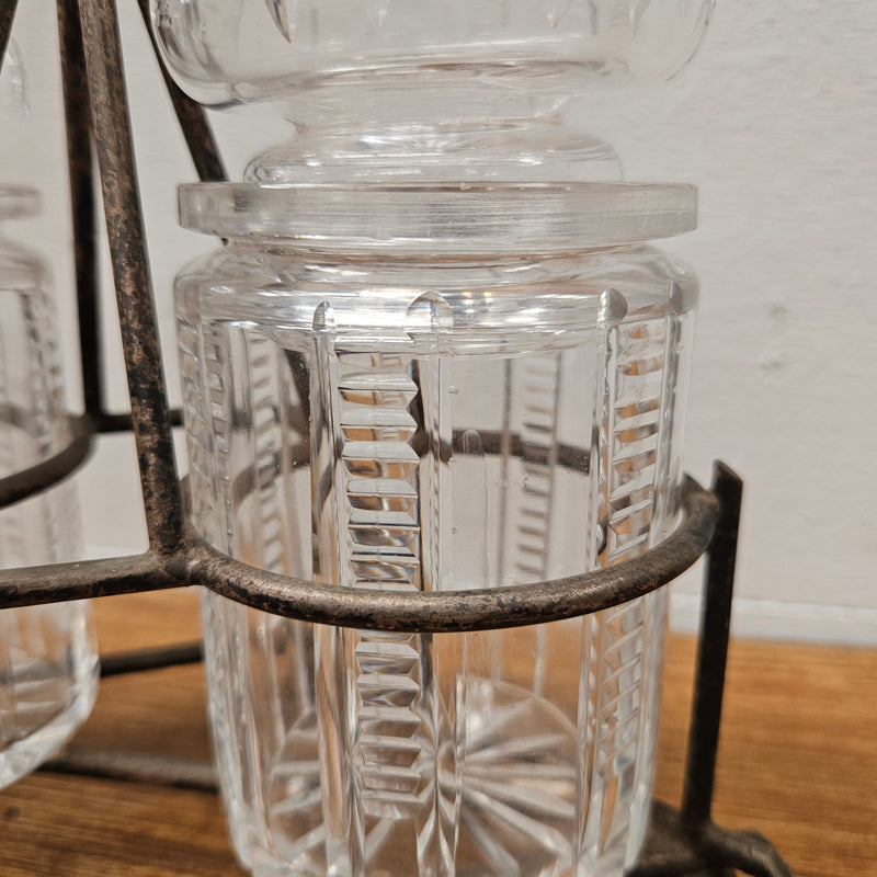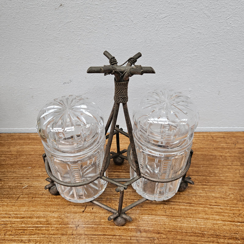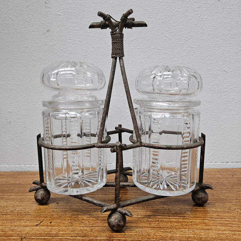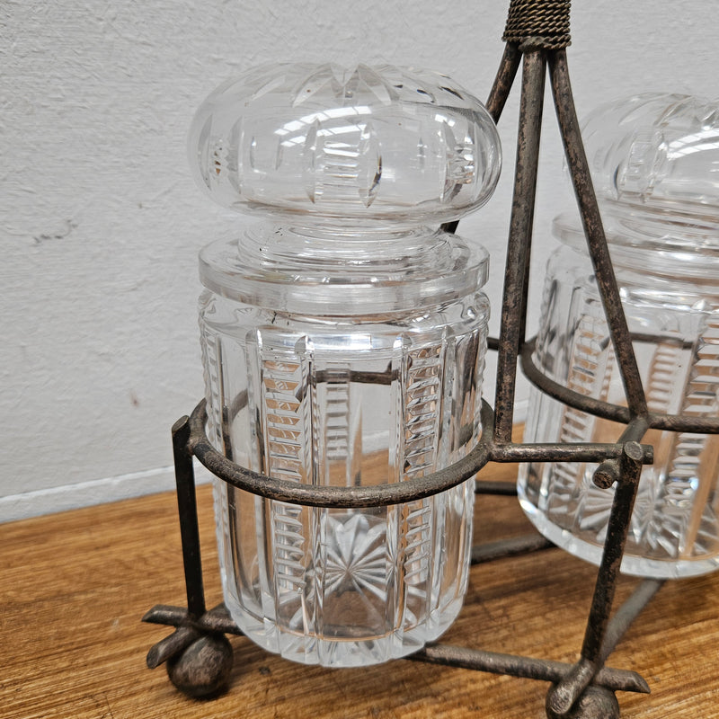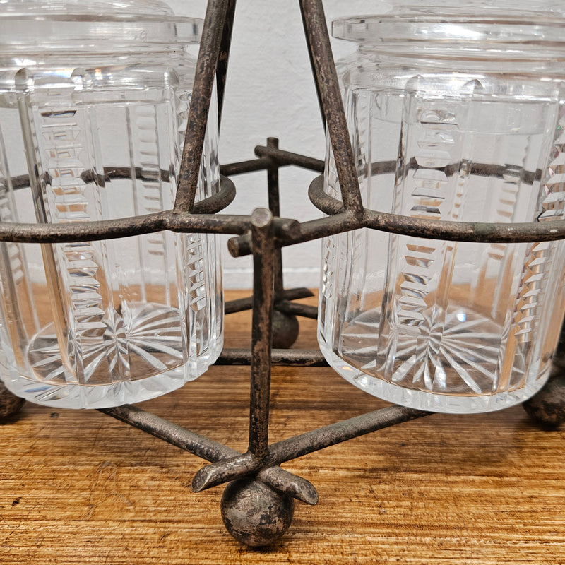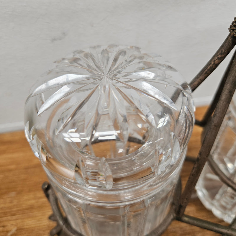 Antique pickle/olive cruet glass jar set in EP stand, beautifully engraved jars. It is in good original condition with one of the lids having a chip on the inside as pictured. Please see photos as they form part of the description.