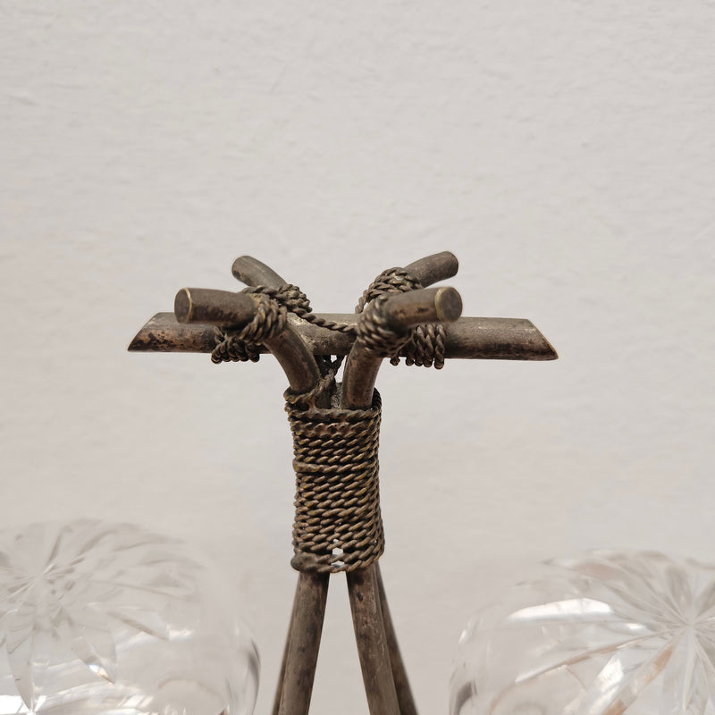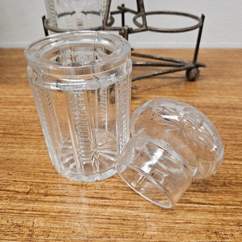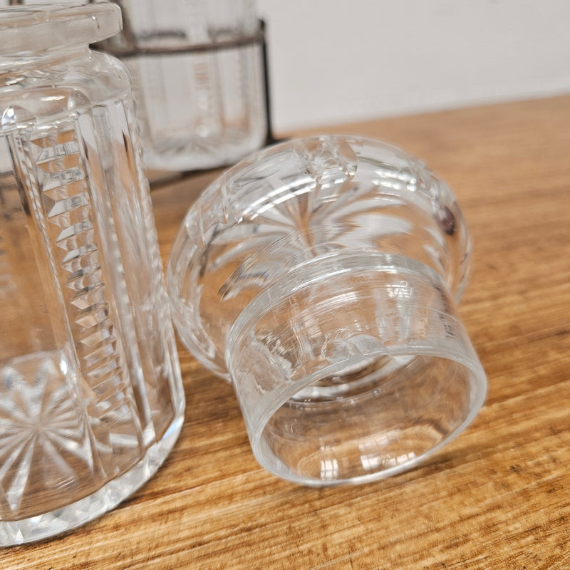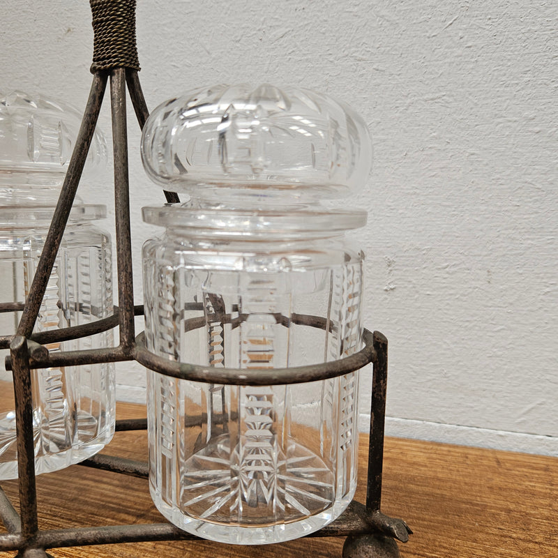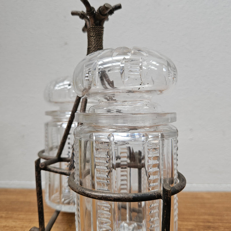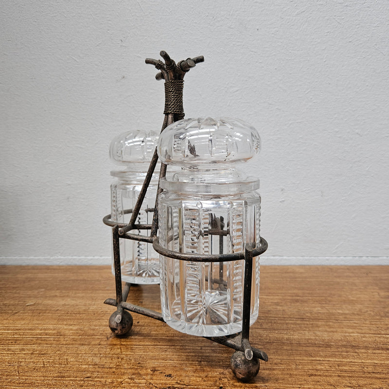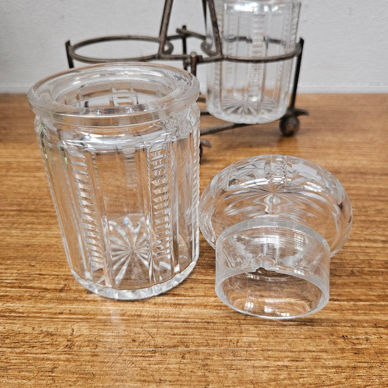 Antique pickle/olive cruet glass jar set in EP stand, beautifully engraved jars. It is in good original condition with one of the lids having a chip on the inside as pictured. Please see photos as they form part of the description.