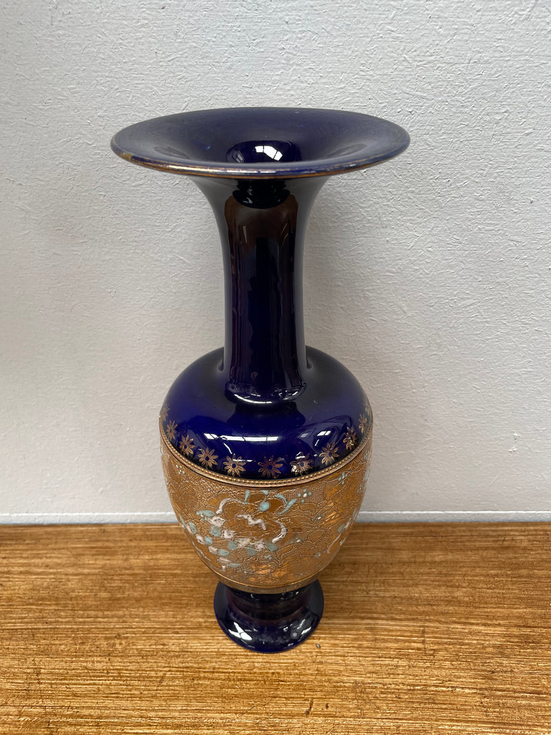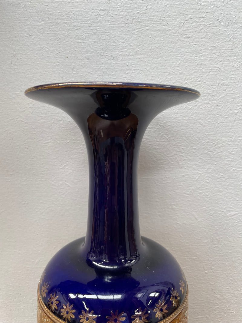 Stunning Antique Royal Doulton vase in blue and gold hand painted decoration. It is in good original condition with some fading to the gold paint due to age. Please see photos as they form part of the description.