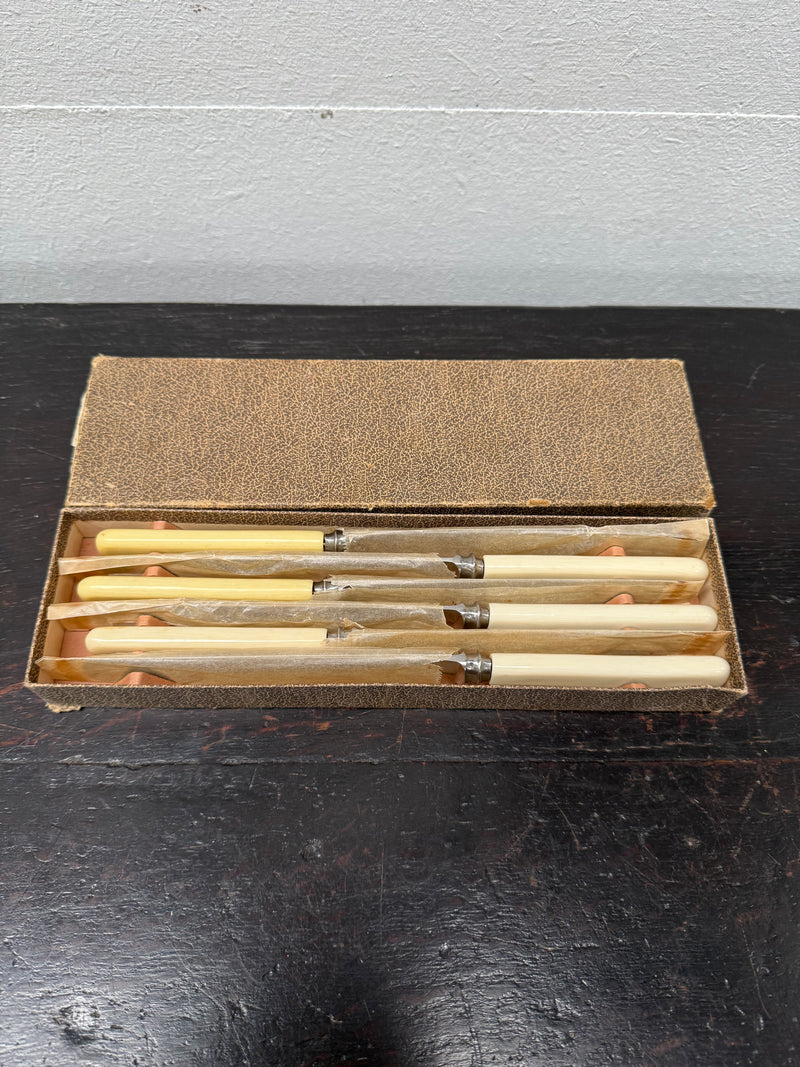 Pristine set of 6 Antique bone handles knives in original box. Chris Johnson & Co Sheffiled England. In good original condition. Please see photos as they form part of the description.