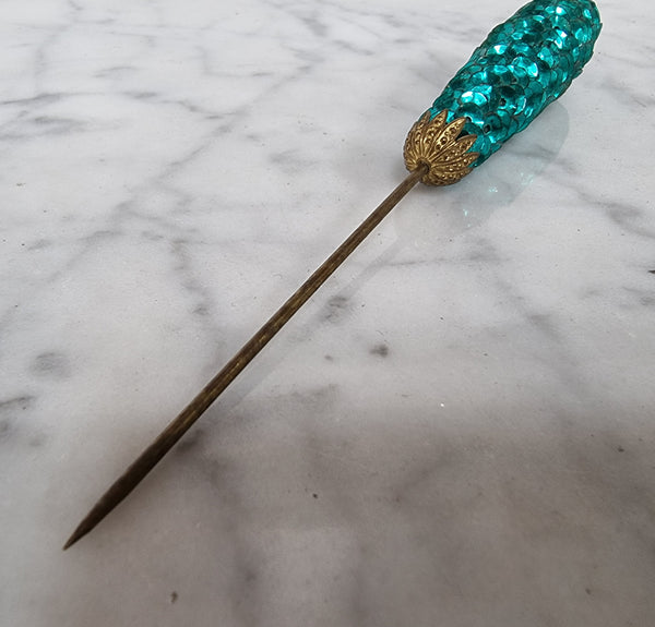 Art Deco blue sequin hat pin, in good condition. See photos as they form part of the description.
