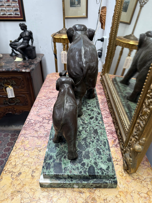 Regulating sculpture representing two elephants, a mother and her baby. It has original green patina and is mounted on a green marble base. Signed "Richard" or Irénée Félix René Richard 1906/1984 French animal sculptor. Circa: 1930's
