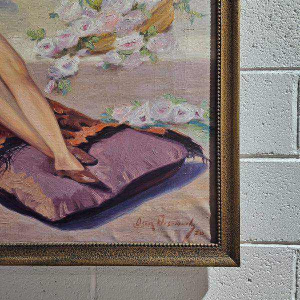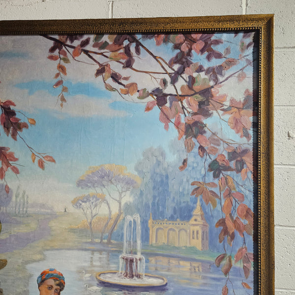 Large Art Deco oil on canvas painting of a women lounging around with beautiful backdrop, it is also signed. It is in good original detailed condition and has been sourced from France.