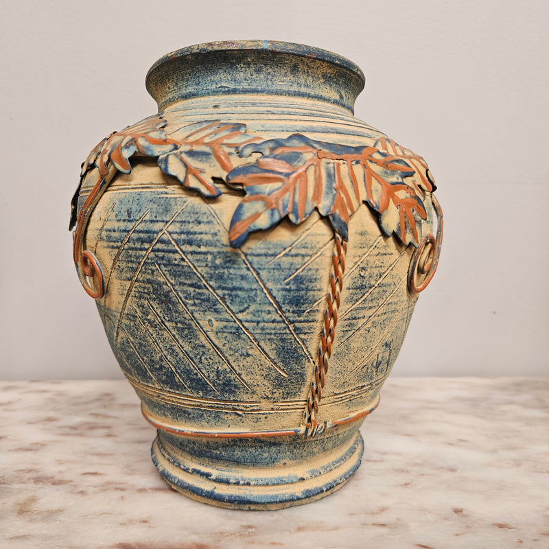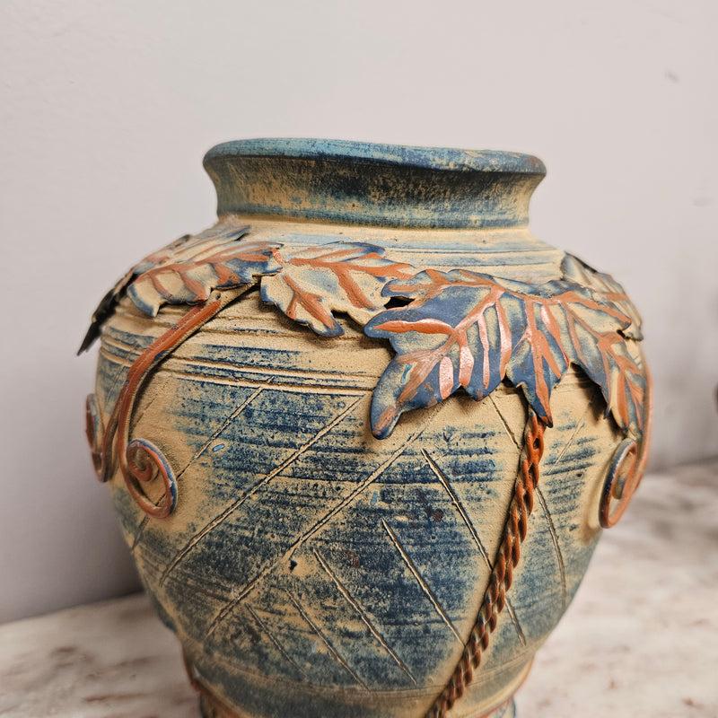 Stunning hand made art pottery vase with a leaf design and is in good original condition. Please see photos as they form part of the description.