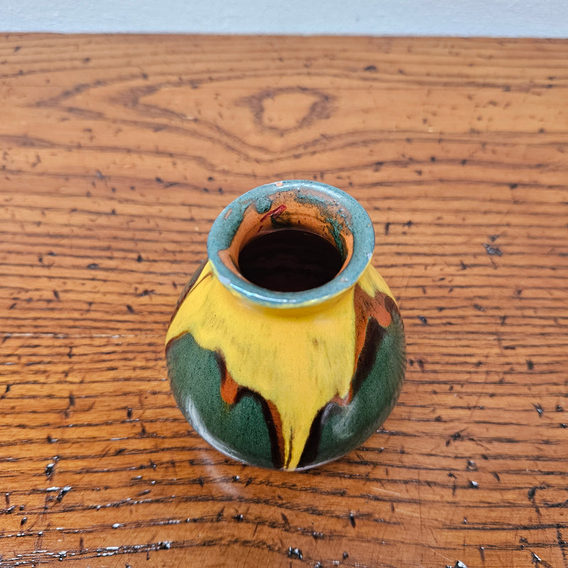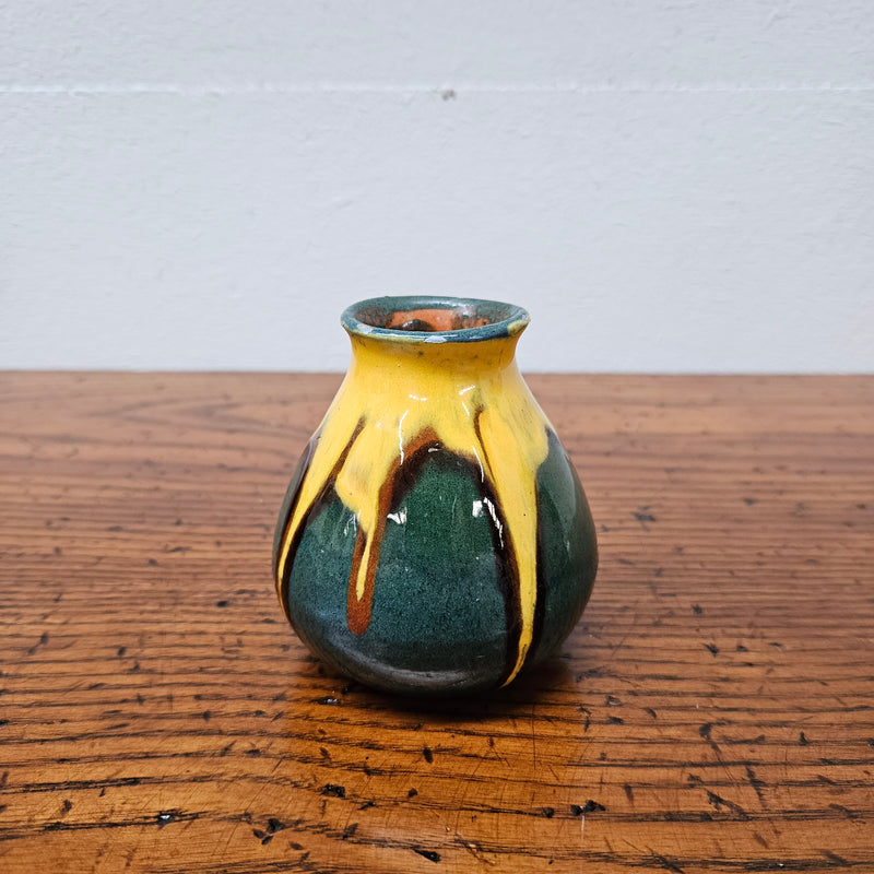 Signed art pottery small vase. Yellow, brown and green glaze. In good condition. Please see photos as they form part of the description.