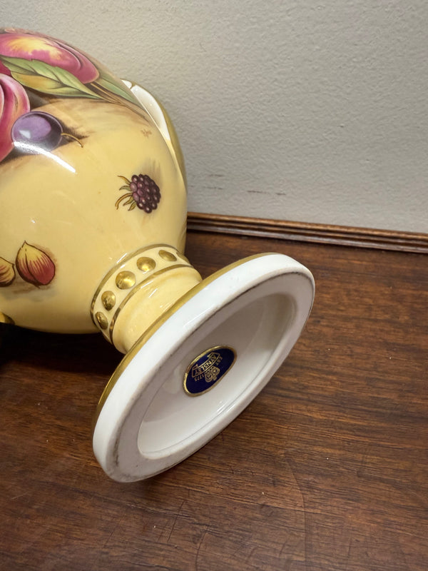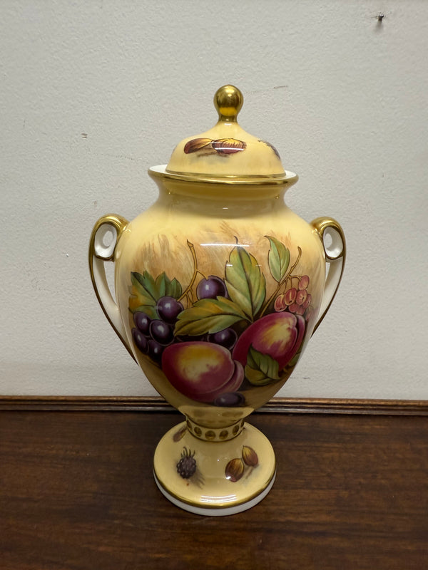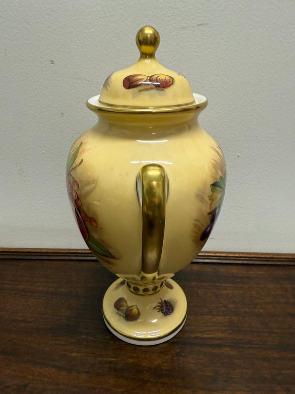 Attractive Aynsley double handled lidded Orchard Gold urn. Beautifully decorated with fruit and nuts. In good original condition. Please see photos as they form part of the description.