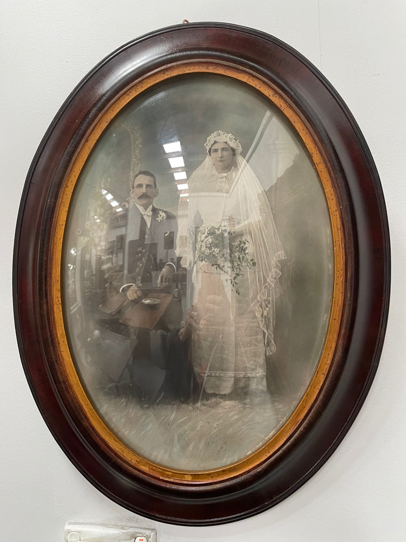 Pretty oval Art Deco photo frame with a beautiful wedding photo and concave glass. Lovely patina on the frame and ready to hang. Sourced locally and in good original condition. Please view photos as they help form part of the description and condition.