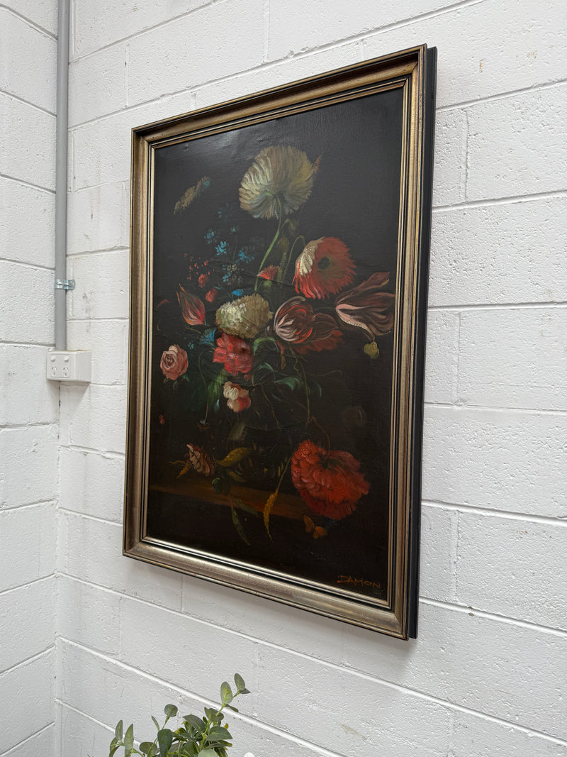 Striking Dutch style signed oil painting on canvas of flowers in a vase. Very moody and lovely dark background. It is framed and ready to hang. Please see all photos as they form part of the description and condition.