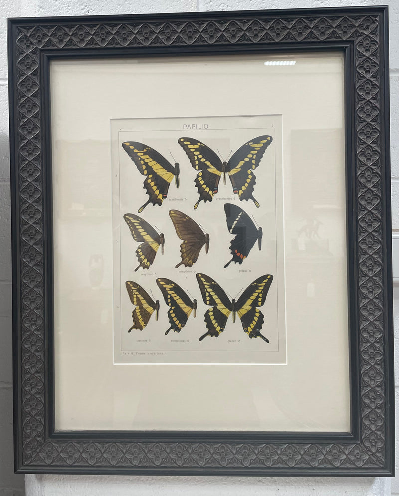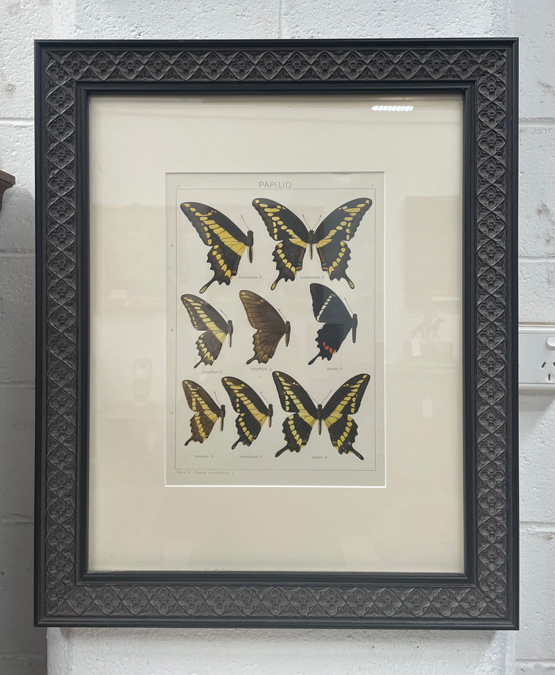 Lovely pair of butterfly prints in a black ornate frames. They are in good original condition and have been sourced locally. Please see photos as they form part of the description.