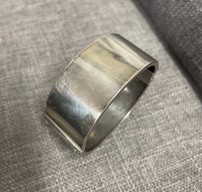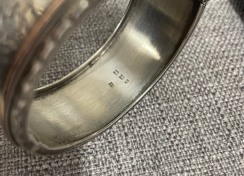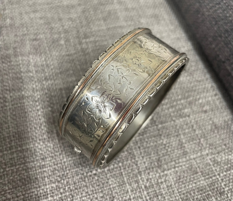 Circa: 1885 Birmingham Silver engraved and hinged bracelet with gold inset bands. In good original condition, please view photos as they help form part of the description.