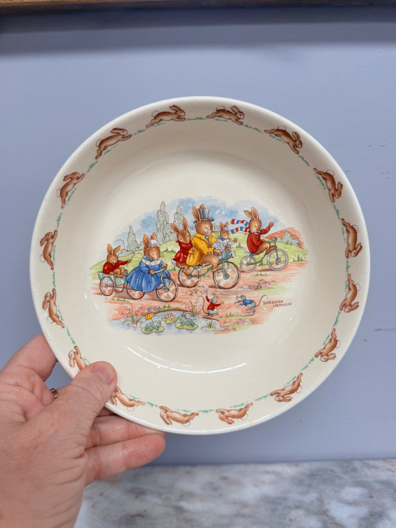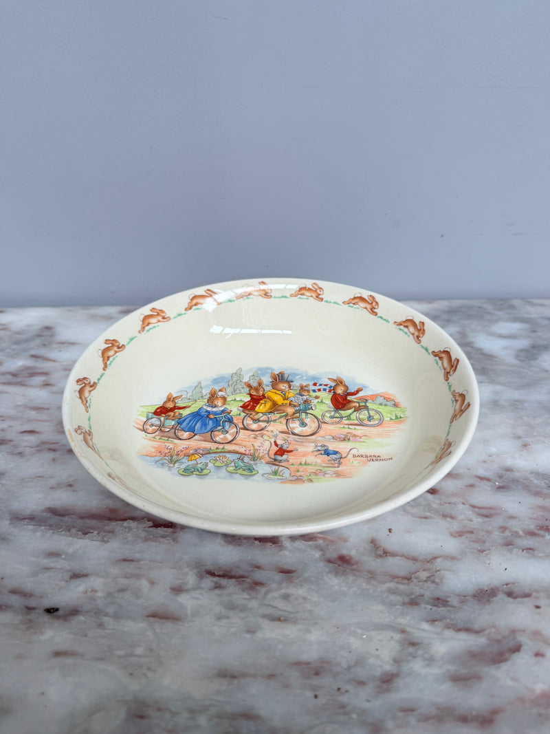 Royal Doulton Bunnykins bowl with a family cycling and it is signed 'Barbara Vernon'. It is in good original condition. Please see photos as they form part of the description.