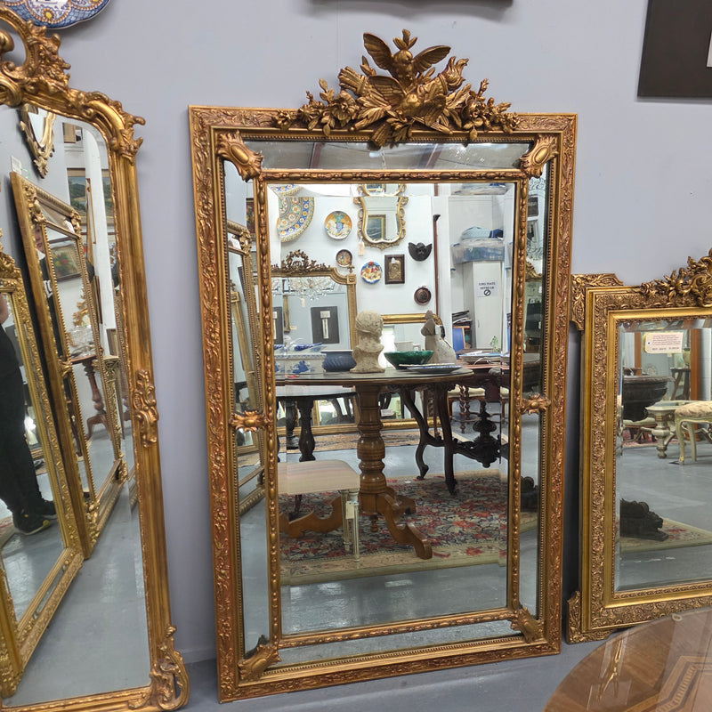 Impressive 19th Century French gilt cushion mirror of large proportions. The frame is decorated with lilies and butterflies around and topped off by a charming central scroll featuring birds and flowers. In good original condition with the mirror showing slight signs of age. Please see photos as they form part of the description and condition.