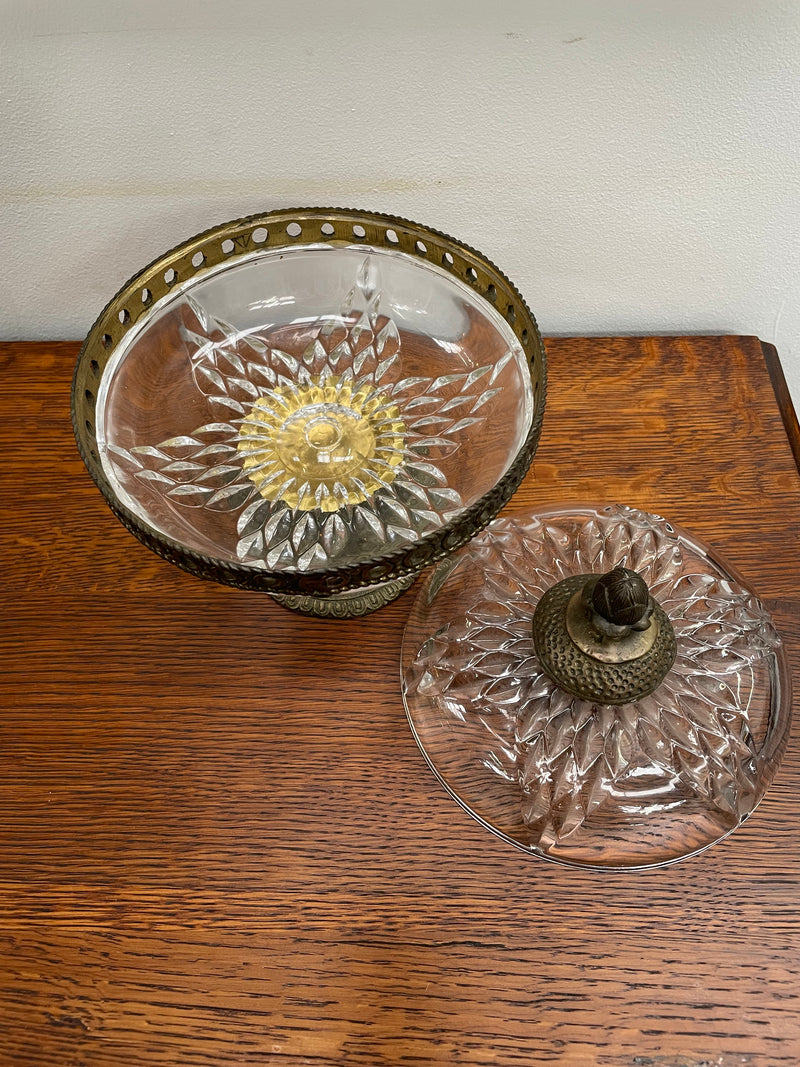 Beautiful decorative glass and metal covered comport with a lid. There are no chips or cracks to the glass and it is in overall good original condition. Please see photos as they form part of the description.