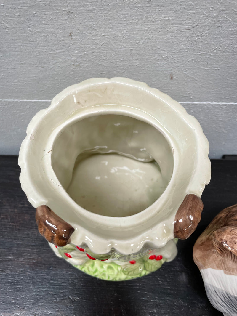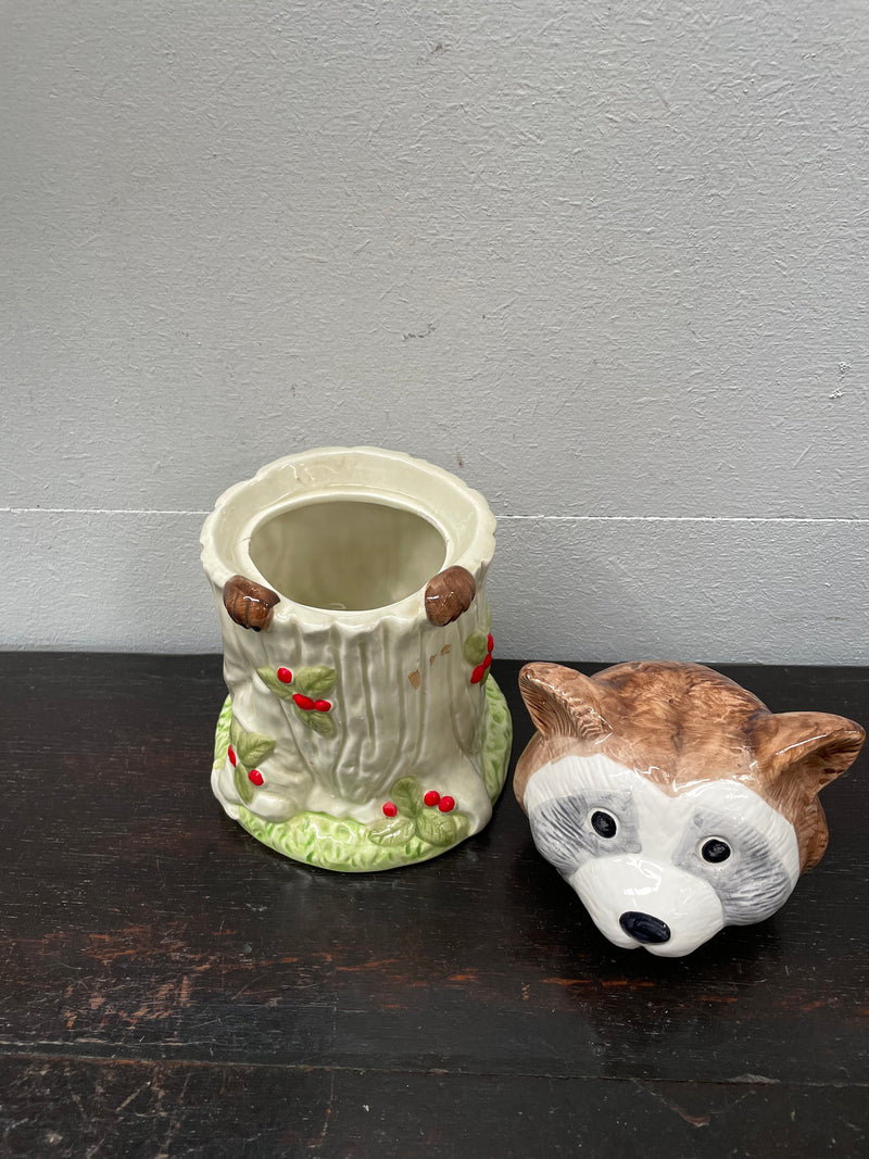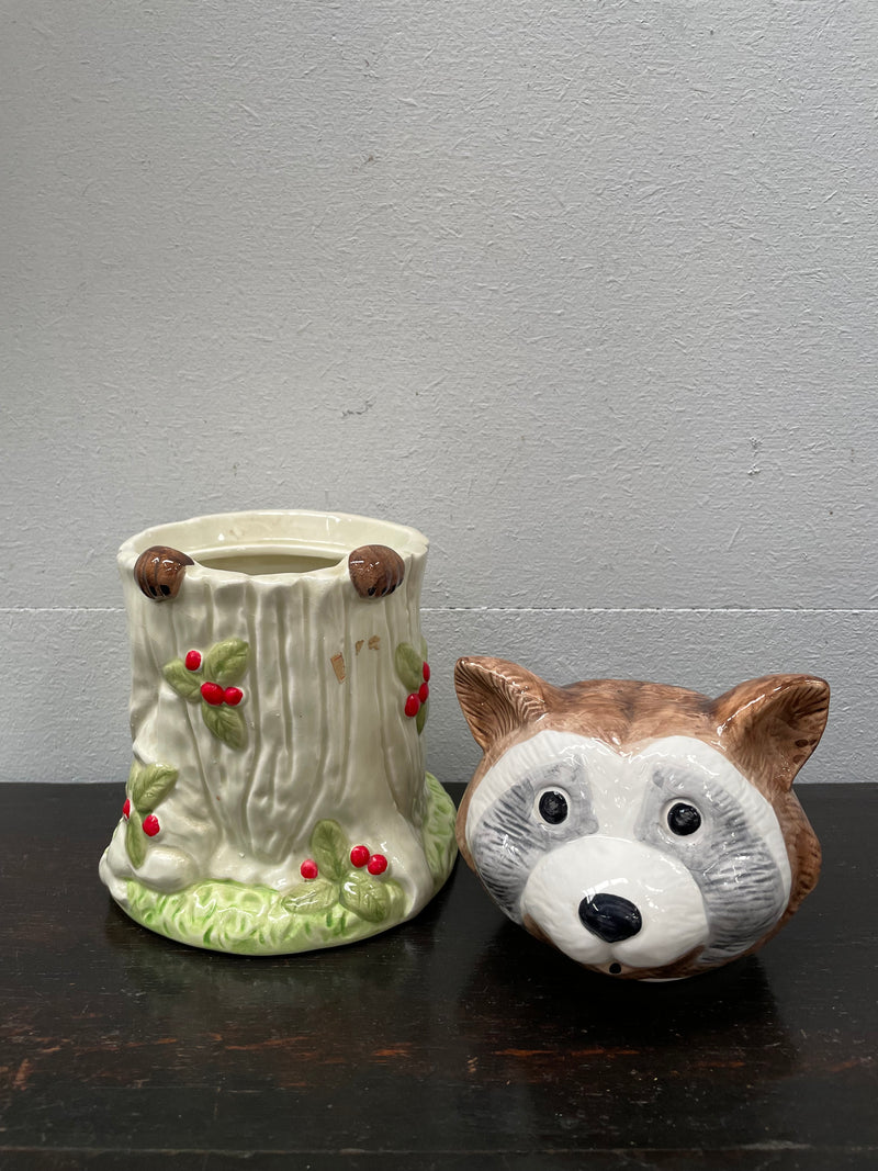 Delightful china Racoon cookie jar make in Taiwan. In original condition. There has been a repair inside top rim . Please see photos as they form part of the description.