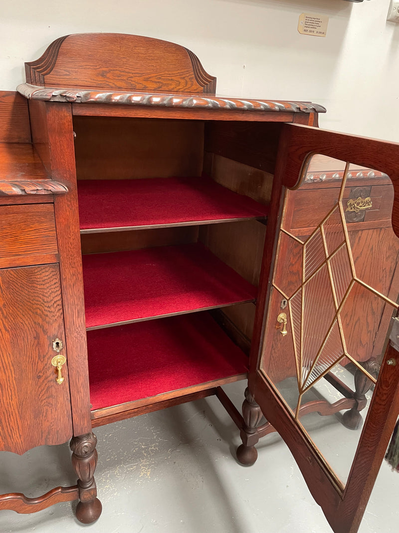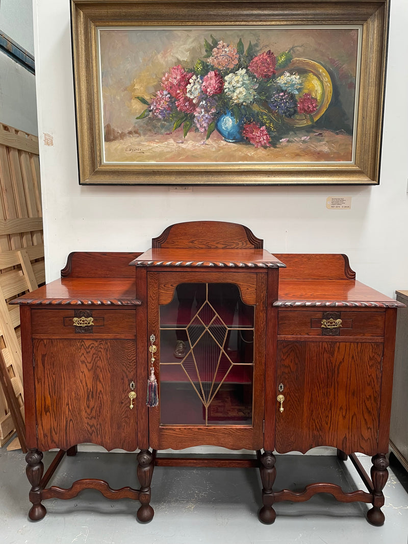 Australian Oak sideboard, with mahogany stain. Features two drawers, two cupboards and a central display cupboard with leadlight door. It has a rope edge and drawers and cupboards are lined with felt. In good original condition. Please view photos as they help to form part of the description and condition.