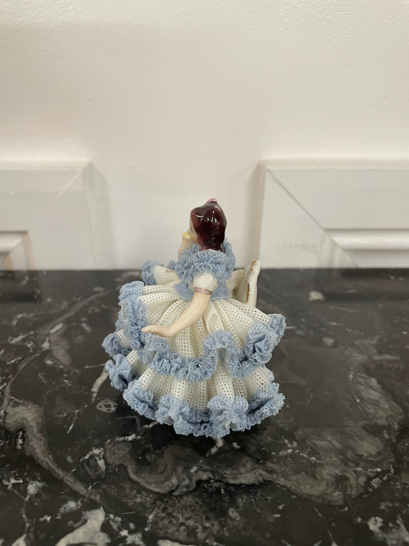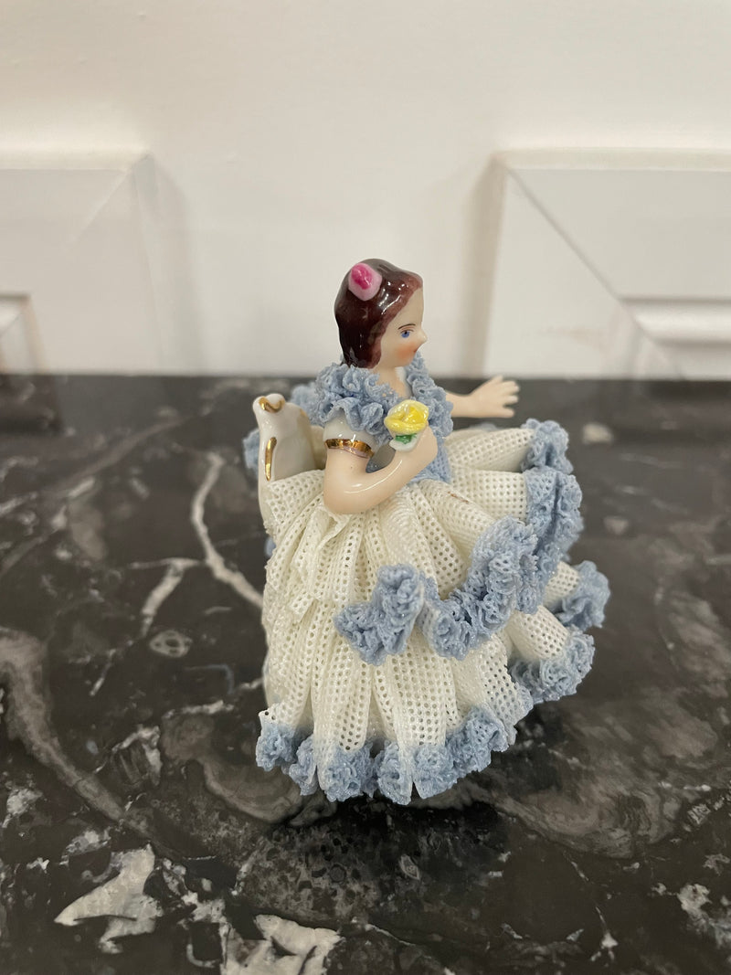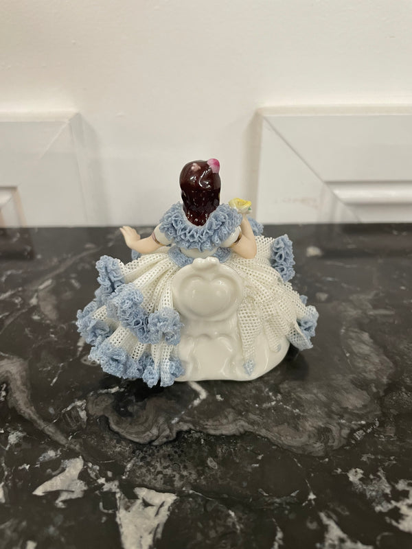Dresden lace figurine stamped underneath and made in Germany. In good vintage condition with some slight damage to lace. Please view photos as they help form part of the description and condition.