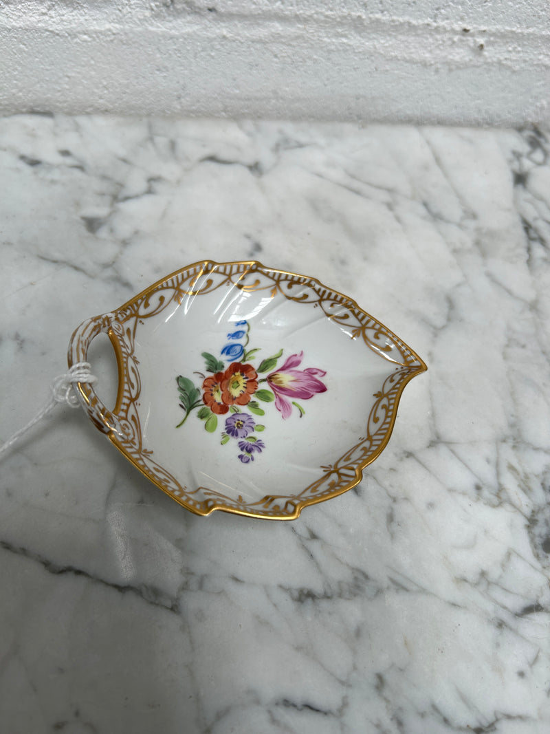 Lovely leaf shape Dresden trinket dish with a floral design and gold trimming. It is in good original condition. Please see photos as they form part of the description