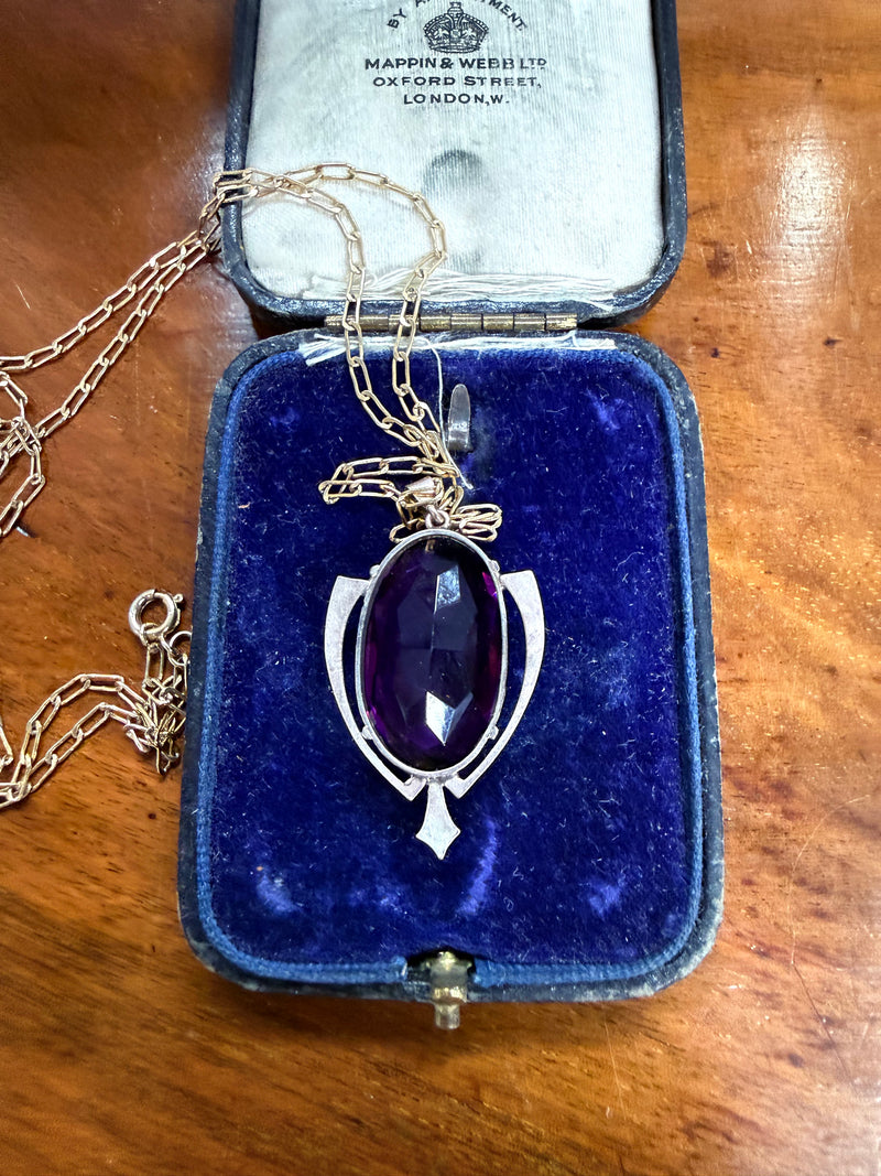 Edwardian 9ct Gold Silver Lined Amethyst Pendant & Chain