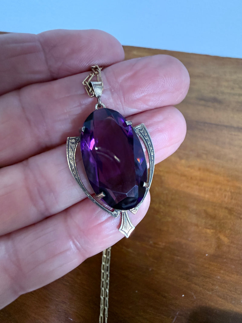 Impressive Edwardian 9ct gold lined amethyst pendant and chain. In good original condition. Please see photos as they form part of the description. Pendant measures 4cm ht. 2.5cm width.