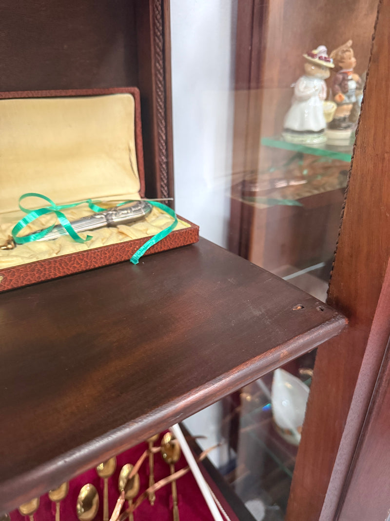 Stunning two door Edwardian marquetry inlay and hand painted display cabinet. It has two glass front panels and has three internal shelves with two exposed and one shelf behind the door at the bottom. It is in good original condition. It is Circa 1910. Please see photos as they form part of the description and condition.