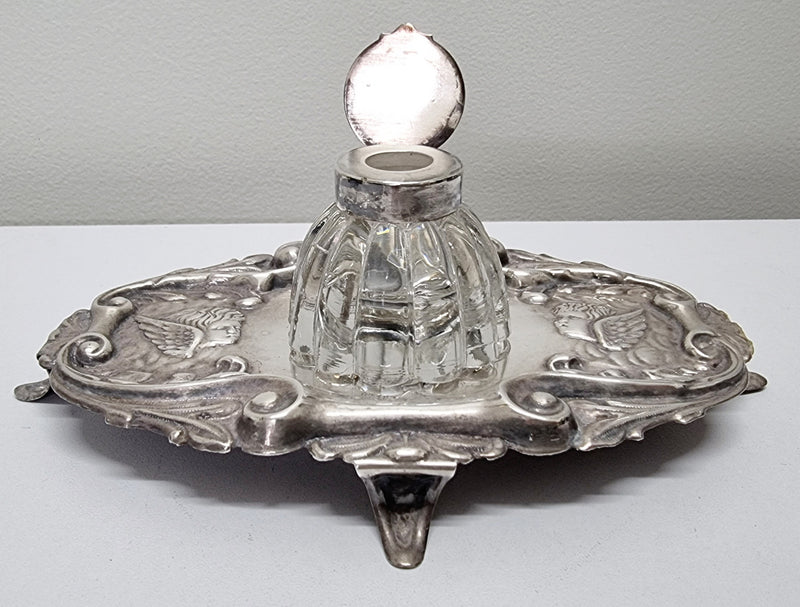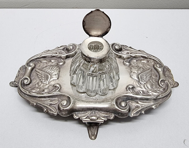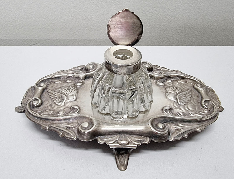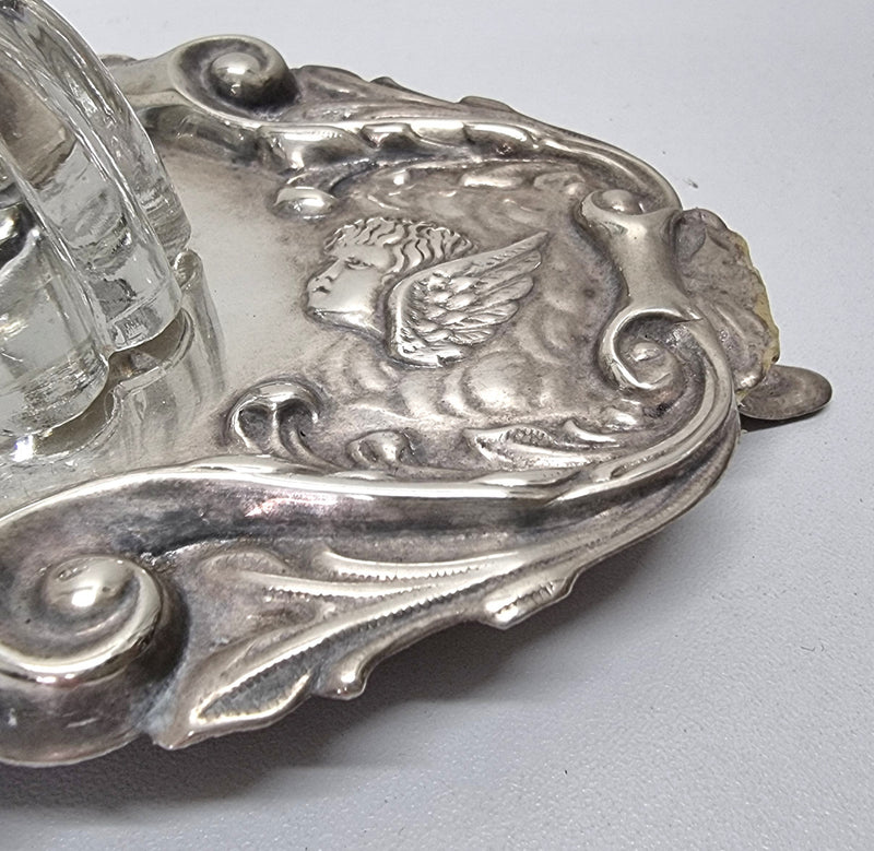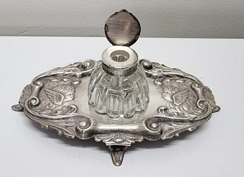 Edwardian Silver Plated Ink Stand Cherub Embossed Design