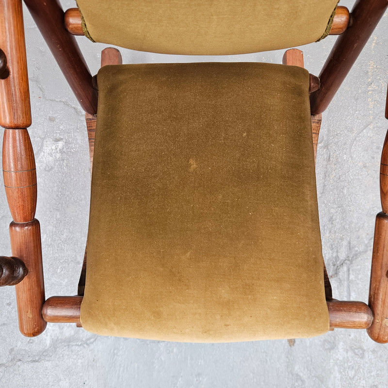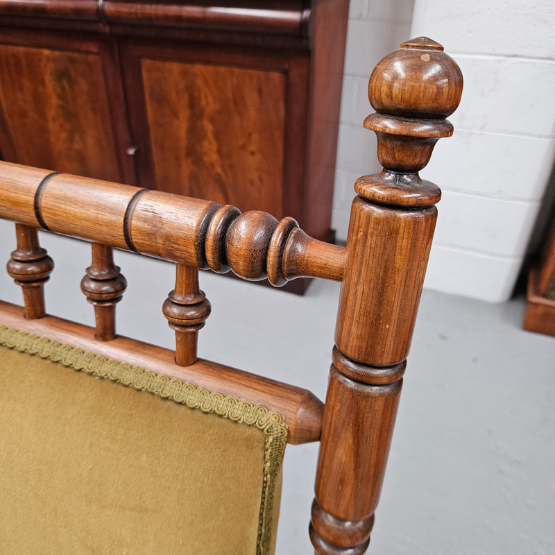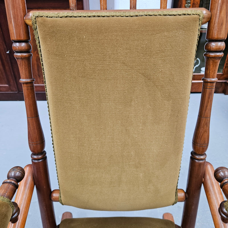 Antique Victorian rocking chair with turned spool posts and supports. Good velvet upholstery. In good original condition. Please see photos as they form part of the description.