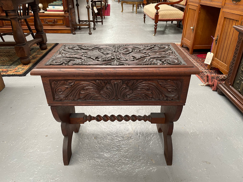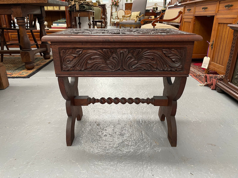 Stunning carved English oak Arts & Crafts piano stool with lift up storage compartment. It is in good original condition. Please see photos as they form part of the description and condition.