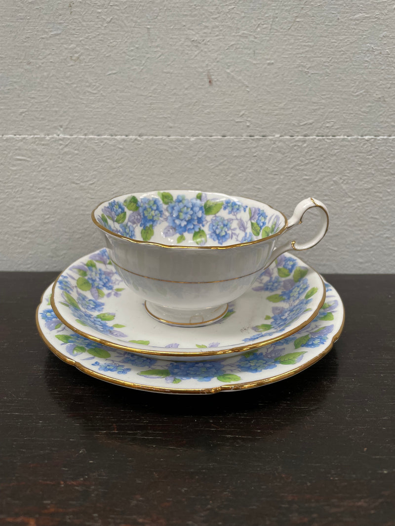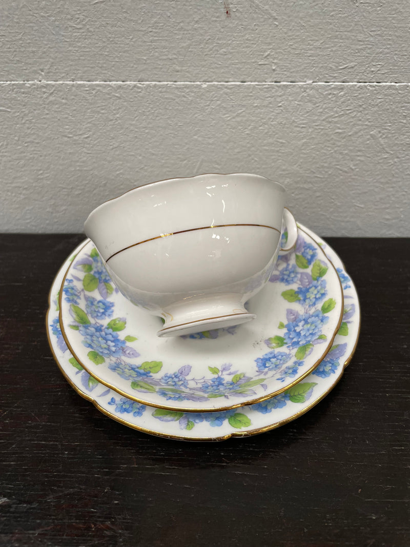 Floral decorated "Grafton" trio. Cup Saucer and Plate with pretty blue hydrangeas. In good original condition. Please see photos as they form part of the description,.
