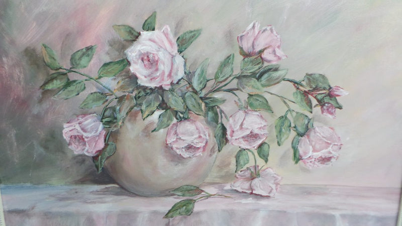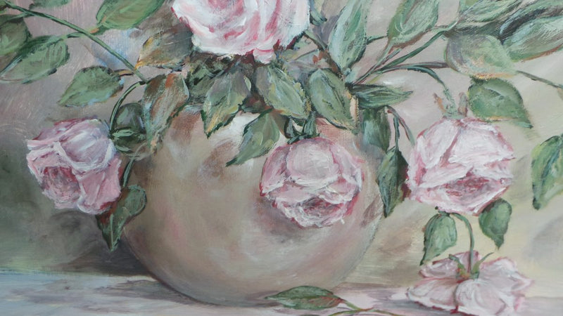 A beautiful signed framed oil on board painting, of a vase of pink roses and in very good condition.